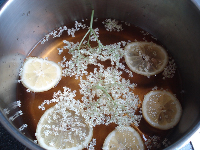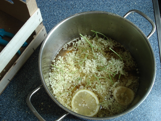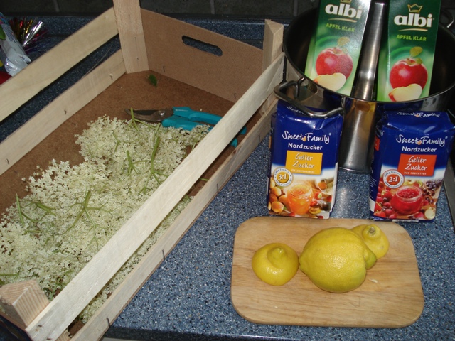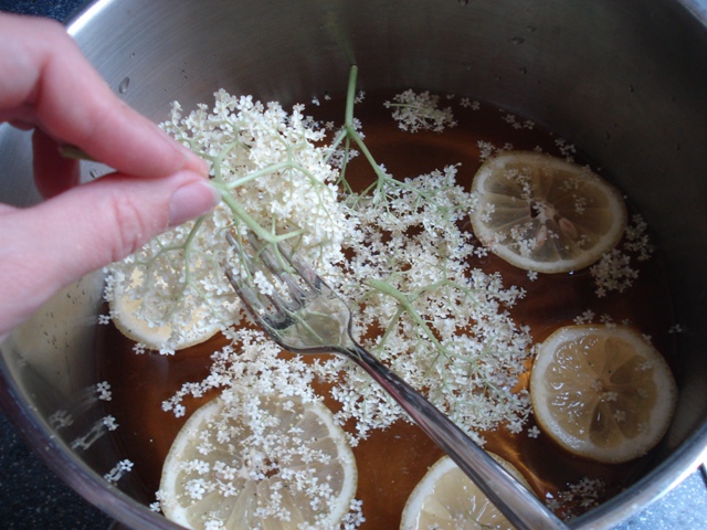 Dann die Holunderblüten. Entweder einfach die Dolden kopfüber in den Saft stellen oder