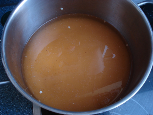 Den Saft in den Topf schütten und ein paar Zitronenscheiben rein.