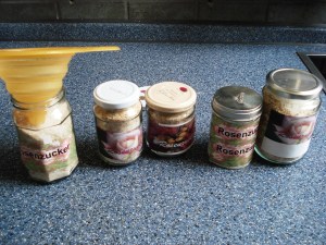 Und fertig ist ein außergewöhnliches Geschenk aus dem eigenen Garten. Rosenzucker kann man z.B. in Schlagsahne oder auch so über den Kuchen streuen.