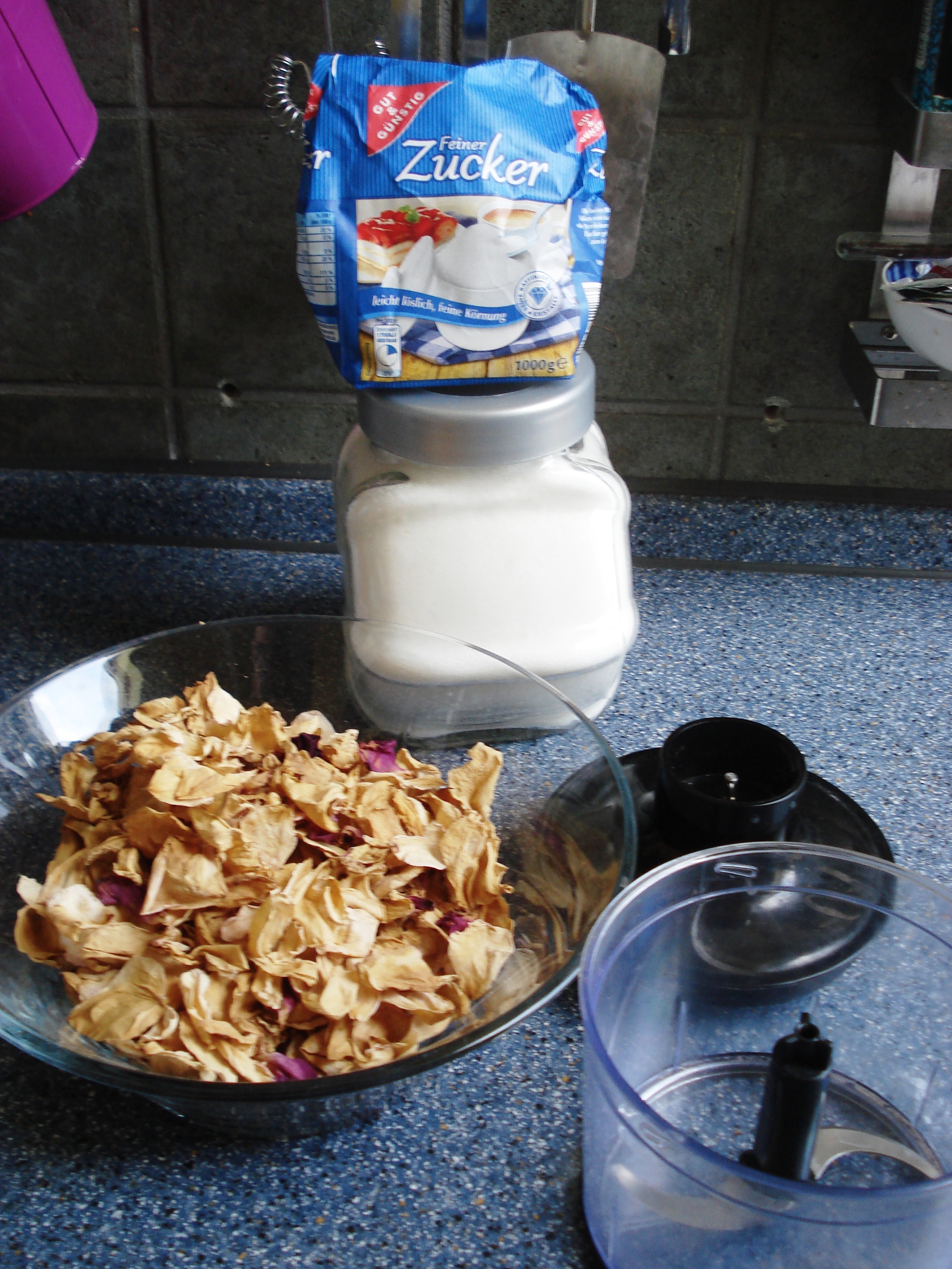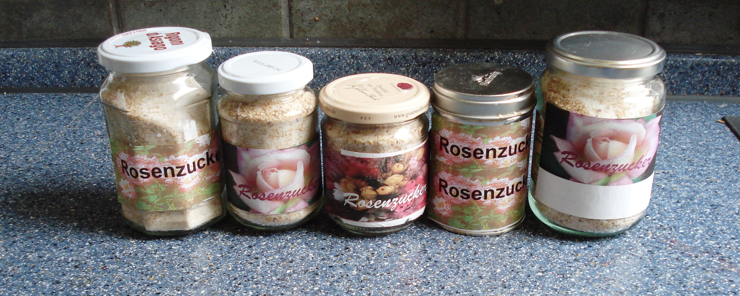 Und fertig ist ein außergewöhnliches Geschenk aus dem eigenen Garten. Rosenzucker kann man z.B. in Schlagsahne oder auch so über den Kuchen streuen.