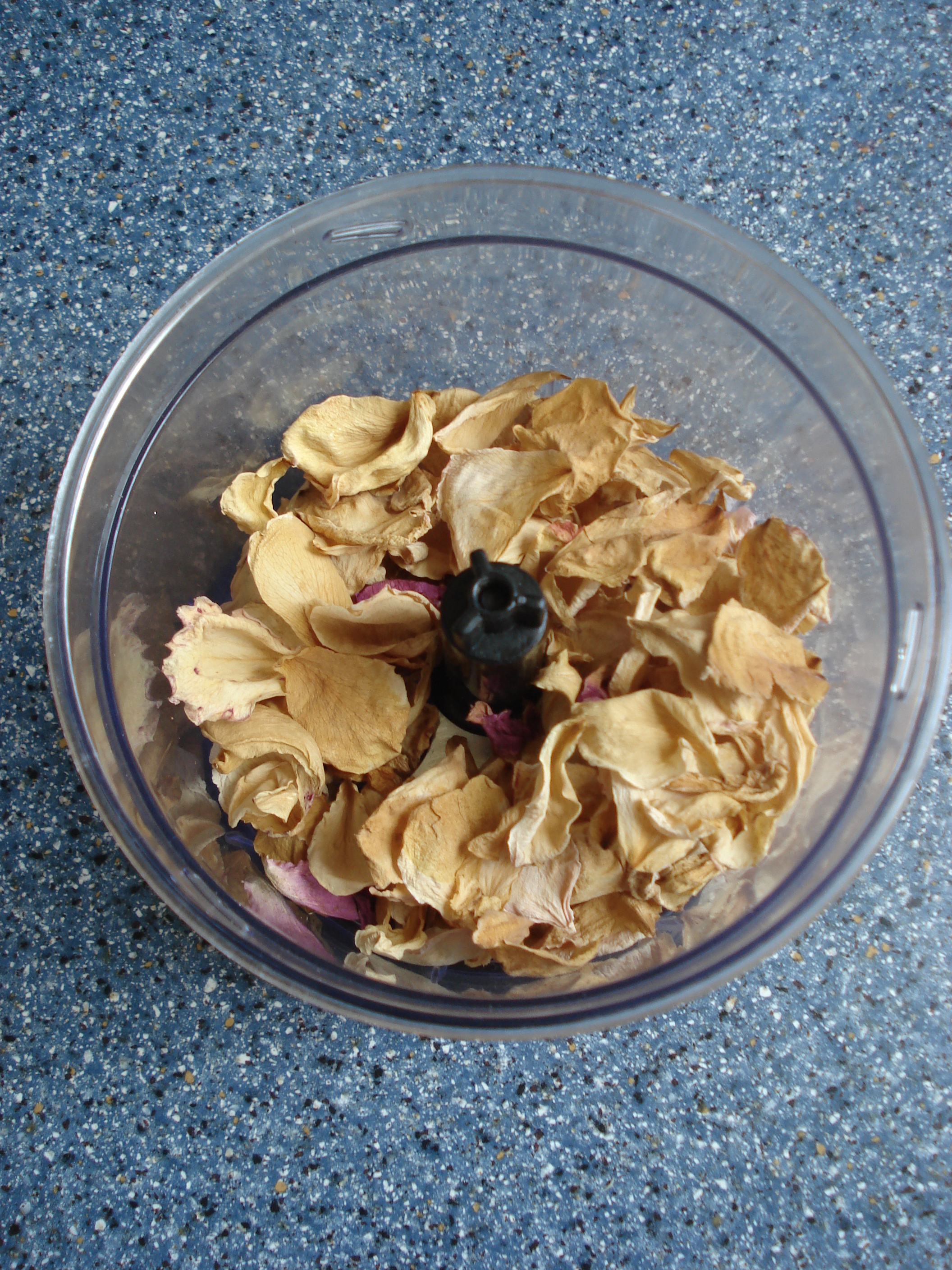 Im Anschluss daran gebt ihr zwei Hände voll Rosen in einen Mixer: