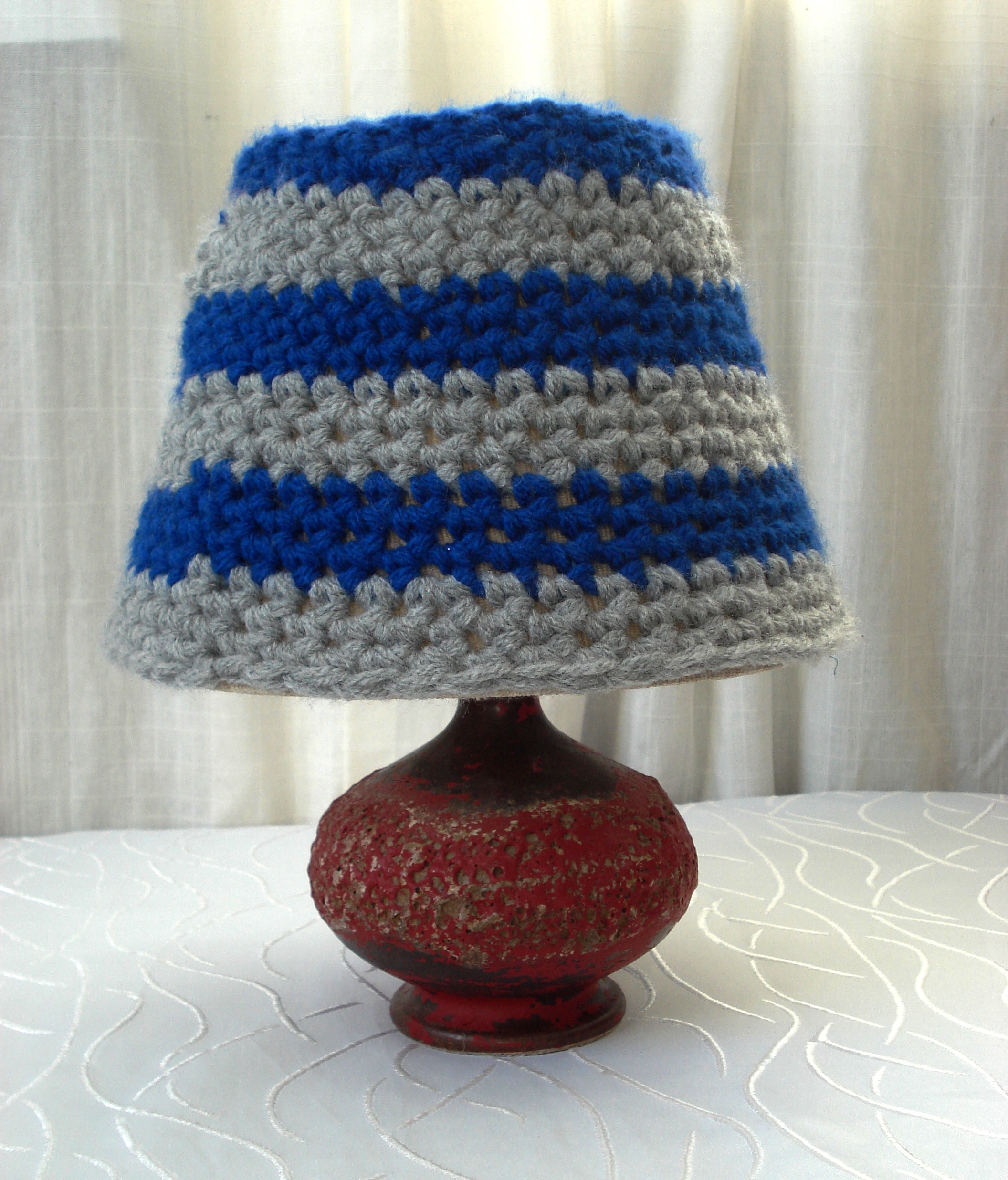 Den Lampenschirm habe ich frei Hand überhäkelt, mit dickem Garn geht das ganz schnell. Das beste daran: Wenn einem die Farbe oder die Kombi nicht mehr gefällt, kann man sie einfach neu machen. Ich habe dickes Garn der Stärke 12 genommen und einfach in festen Maschen im Kreis gehäkelt und in ungefähr jeder zweiten Reihe eine Zunahme genommen – solange bis es gut auf den Schirm gepasst hat. Das war wirklich ganz einfach, ich musste es nur an den Schirm anhalten und gucken, ob es passt.