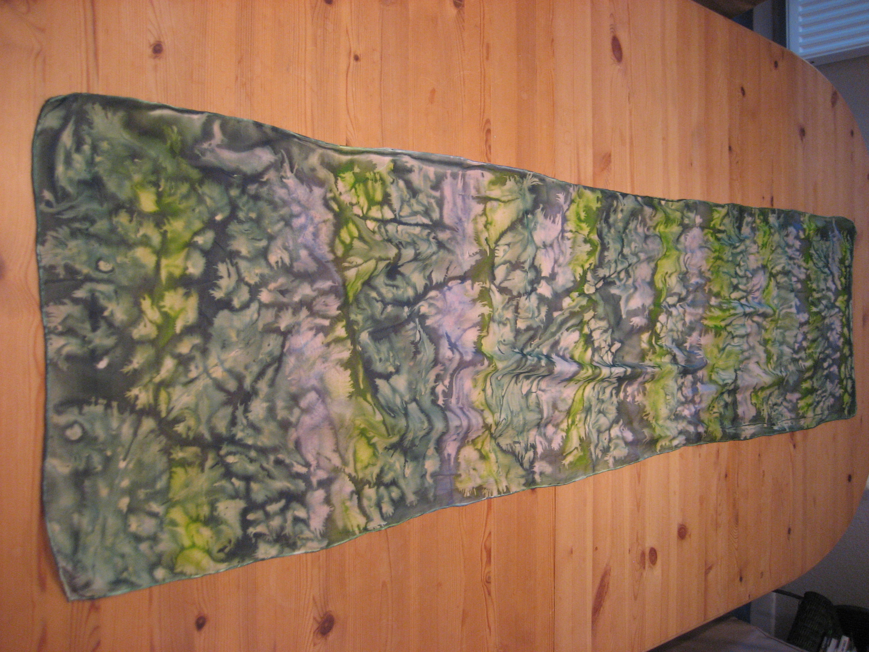 Dann wurde der Schal zwischen zwei Geschirrtüchern ausgiebig gebügelt und die Farbe somit fixiert. Danach wurde der Schal vorsichtig mit ein wenig Waschmittel gewaschen und nochmals trockengebügelt.