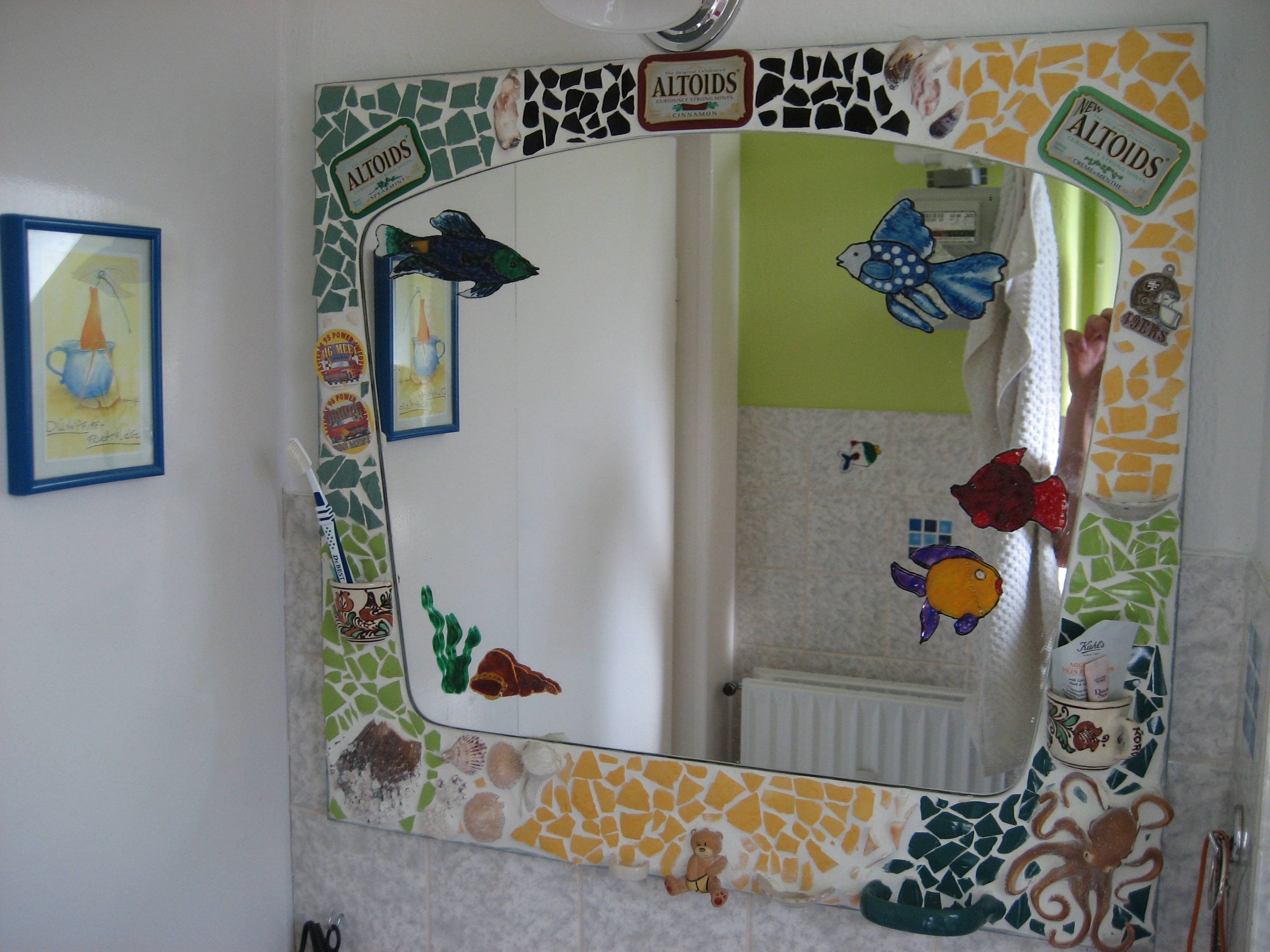 Vor vielen Jahren waren wir einmal in Florida auf einem Kunstmarkt. Dort hatte ein Künstler ganz tolle Sachen aus Mosaikkunst geschaffen. Zu Hause angekommen haben wir es gleich nachgemacht. Der eigentliche Spiegel wurde mittig auf eine rechteckige Holzplatte geklebt. Und dann ging es los: Rundherum kamen viele unserer Erinnerungsstücke, die sonst nur in den Schubladen verkümmert wären wie z. B. die Schlüsselanhänger (der Teddy, der so genüßlich in seiner Unterhose kratzt oder der Football-Helm der 49ers, dies war ein Mitbringsel eines Freundes von seiner ersten USA-Reise) oder die Altoids-Deckel (Altoids sind kleine Pastillen, in Deutschland gibt es nur Pfefferminze, aber in den USA gibt es viele interessante Sorten). Oder die Buttons, die uns an unsere Reisen nach Schweden erinnern. Sie waren dort die „Eintrittskarten“ zu einem riesigen Autotreffen in Västeras. Die Muscheln stammen auch uns unseren Urlauben. Nachdem man also die Erinnerungsstücke rundherum „Probe gelegt“ hat, kommen dann die Mosaikteilchen dran. Wir haben diverse Krüge und Tassen zerkloppt. Dazu haben wir den Krug in ein altes Küchenhandtuch gelegt und vorsichtig mit dem Hammer draufgeschlagen. Und den Bruch dann auf der Holzplatte verteilt. Wir haben nicht nur die Teilchen genommen, sondern auch die Henkel mit eingefügt. Sodass man gleich noch etwas hineinhängen kann, wie eine (Zahn-) Bürste. Beim Verteilen der Mosaikstückchen fand ich es schöner, wenn sie farblich beieinander liegen, d. h. nicht alle Farben gemischt durcheinander. Das hatte ich zuerst ausprobiert, war mir letztendlich doch zu unruhig.