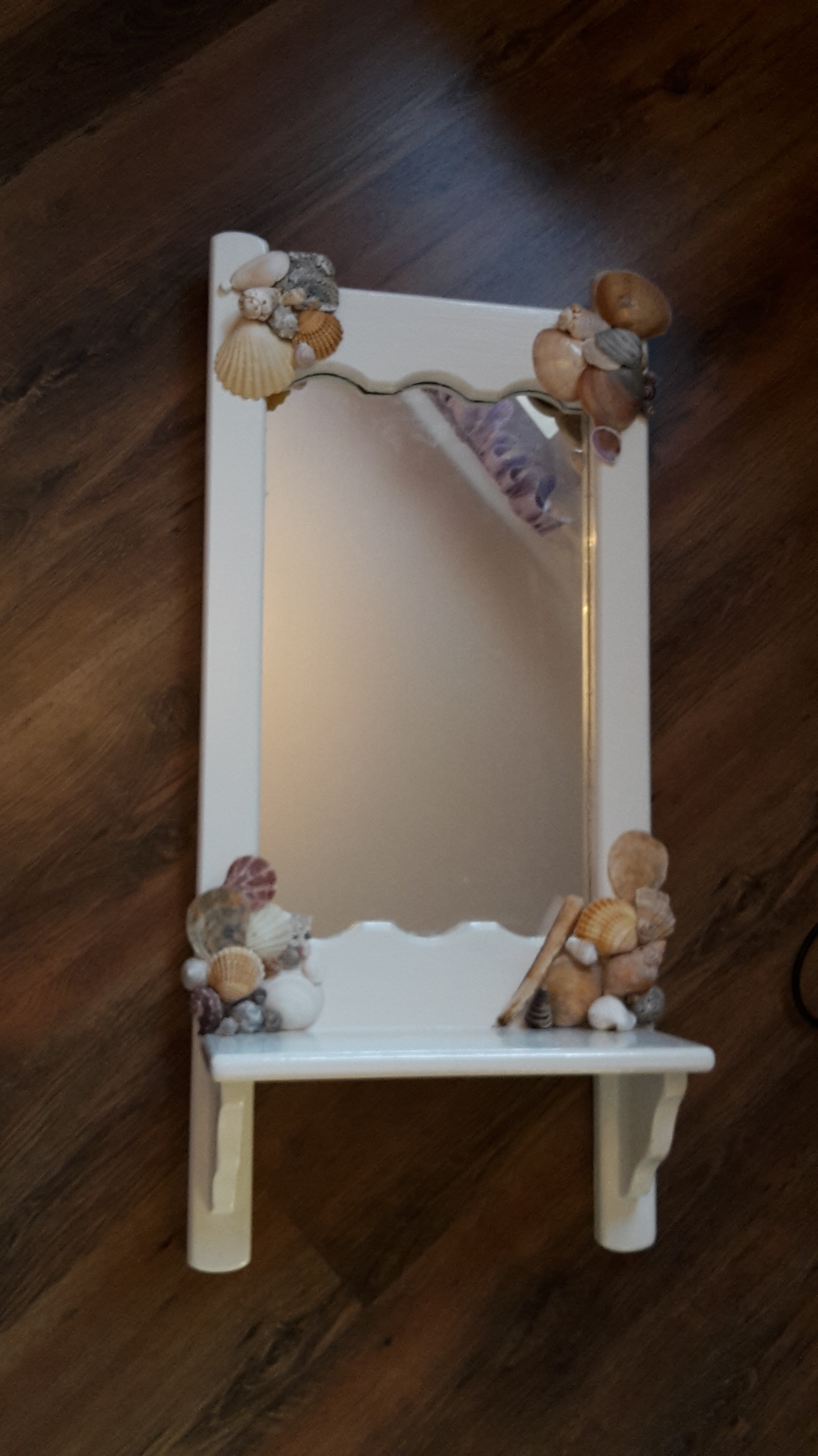 Auf einem einfachen Holzkranz aus dem Weihnachtsschlussverkauf werden mit Heißkleber Muscheln aufgeklebt.