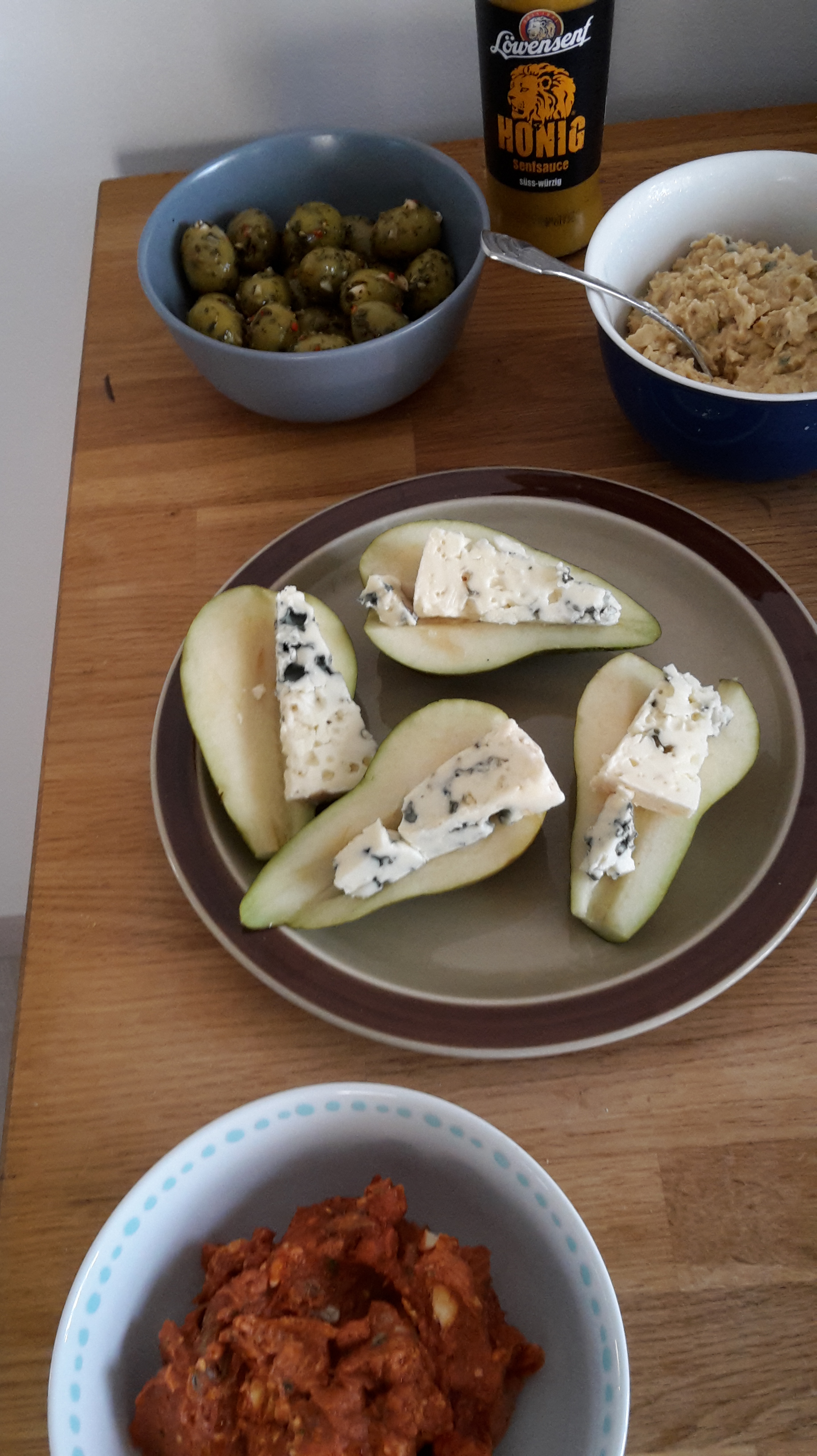 Birnen ein wenig ausgehölt mit Roquefort-Käse gefüllt (braucht länger auf dem Grill bis die Birnen weich sind, aber es lohnt sich: Super lecker)