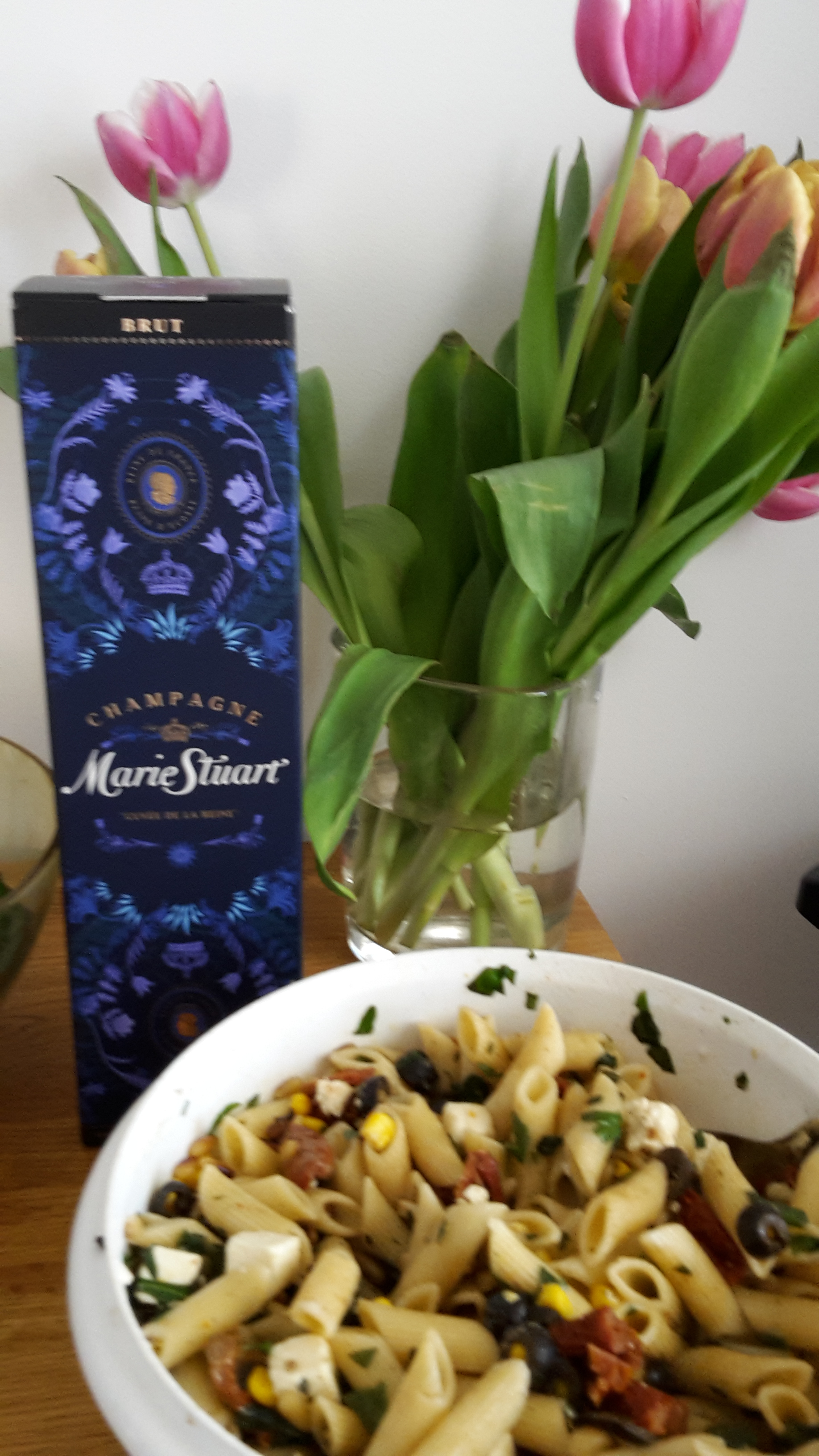 Nudelsalat von einer lieben Freundin mit getrockneten Tomaten, Oliven, Schafskäse und Kräutern.