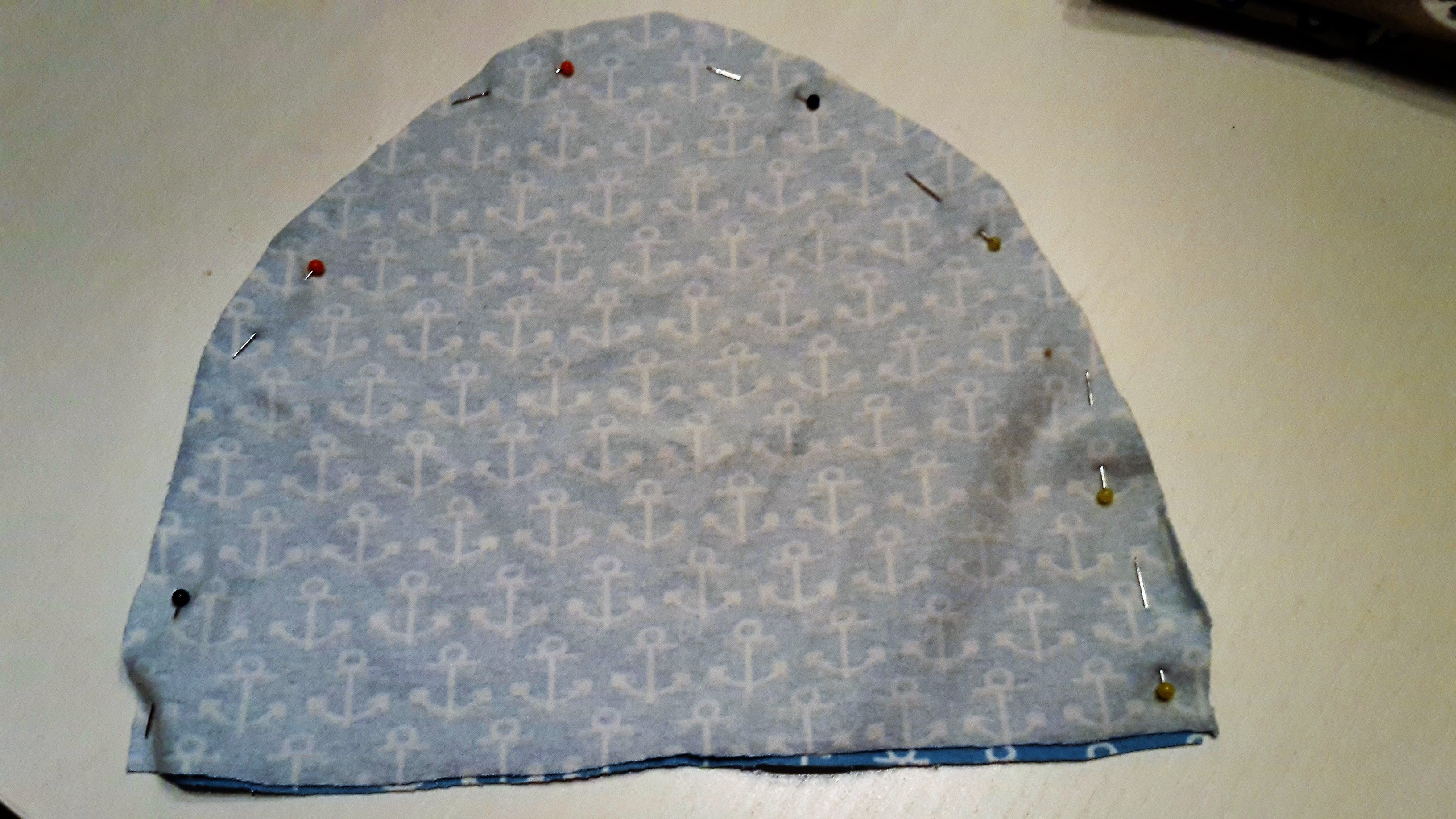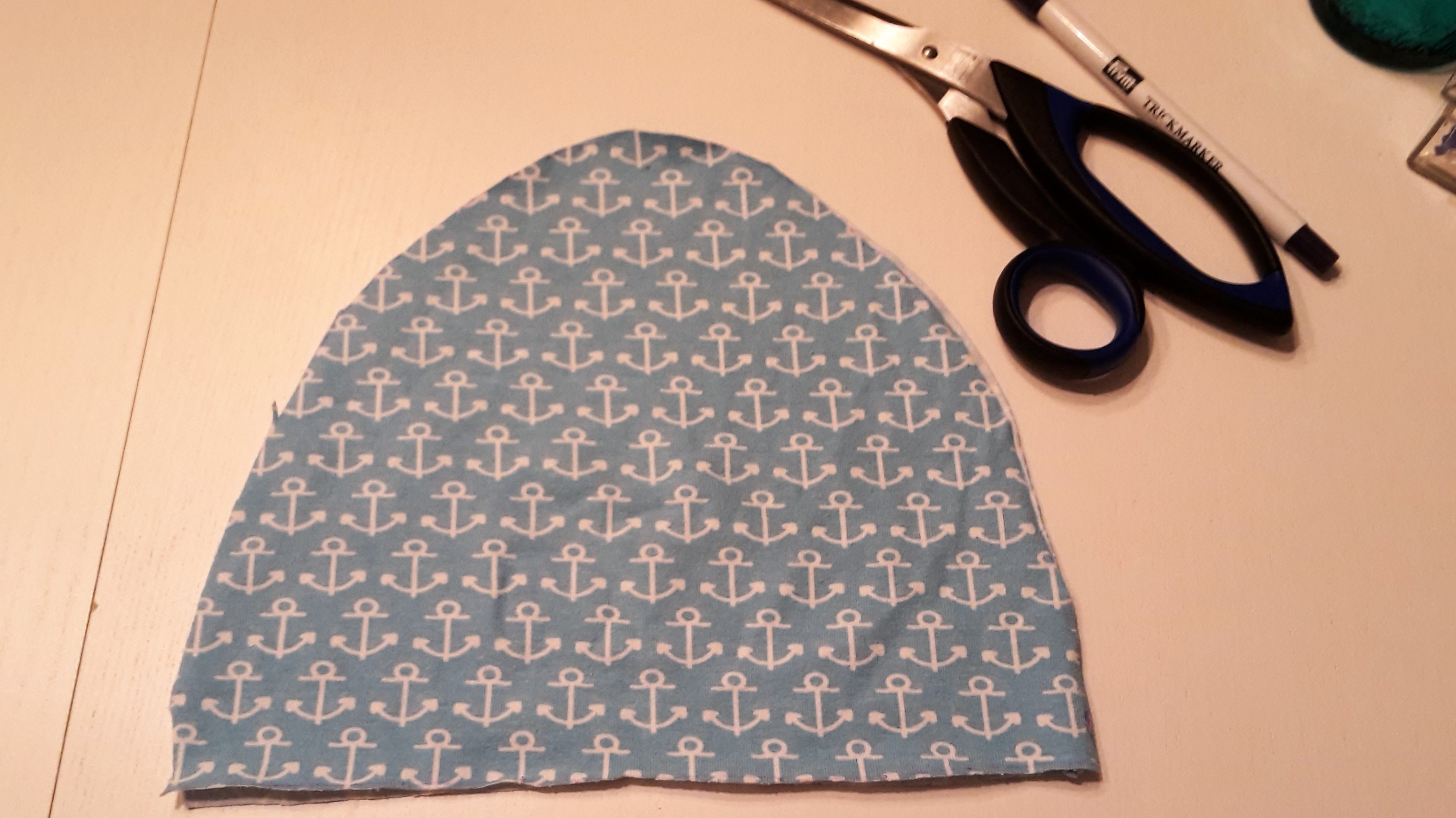 Die Form abmalen mit 1 cm Nahtzugabe. Für diese Mütze mache ich im Gegensatz zu der braunen Vorbild-Mütze ein breites Stoffband als Abschluss unten, sodass die Mütze ein bisschen Beanie-Charakter bekommt. Anschließend ausschneiden und rechts auf rechts (schöne Seite) zusammenlegen und feststecken
