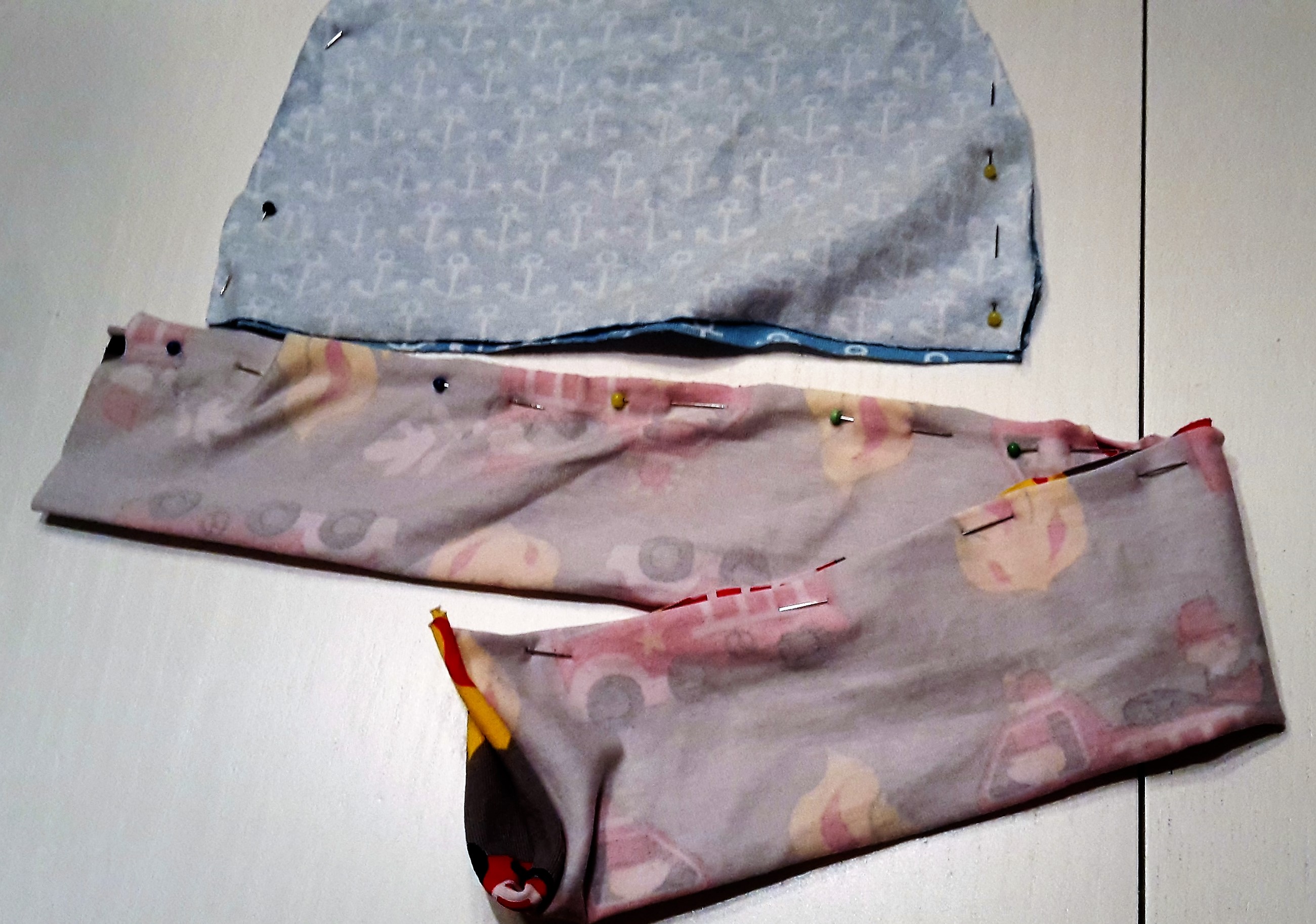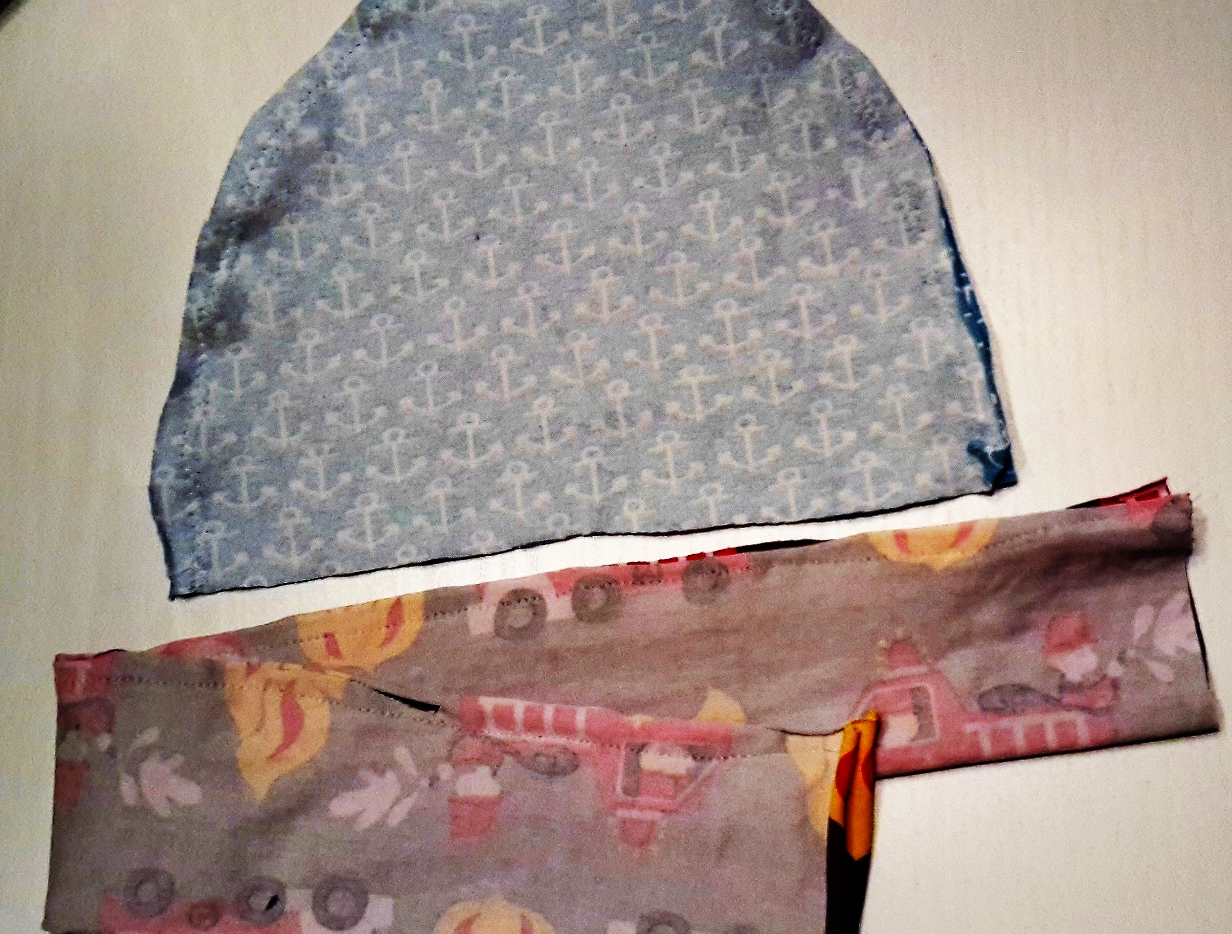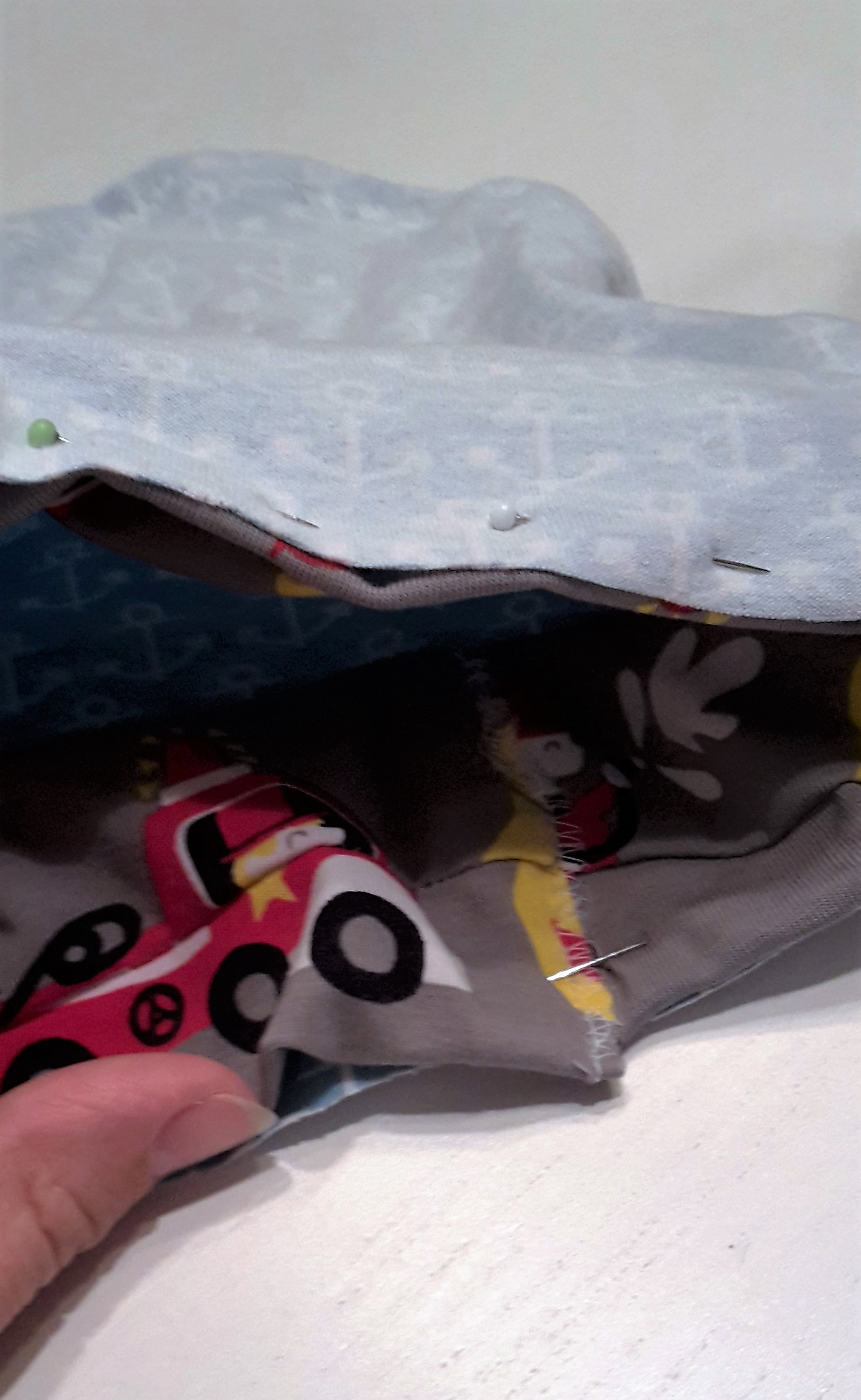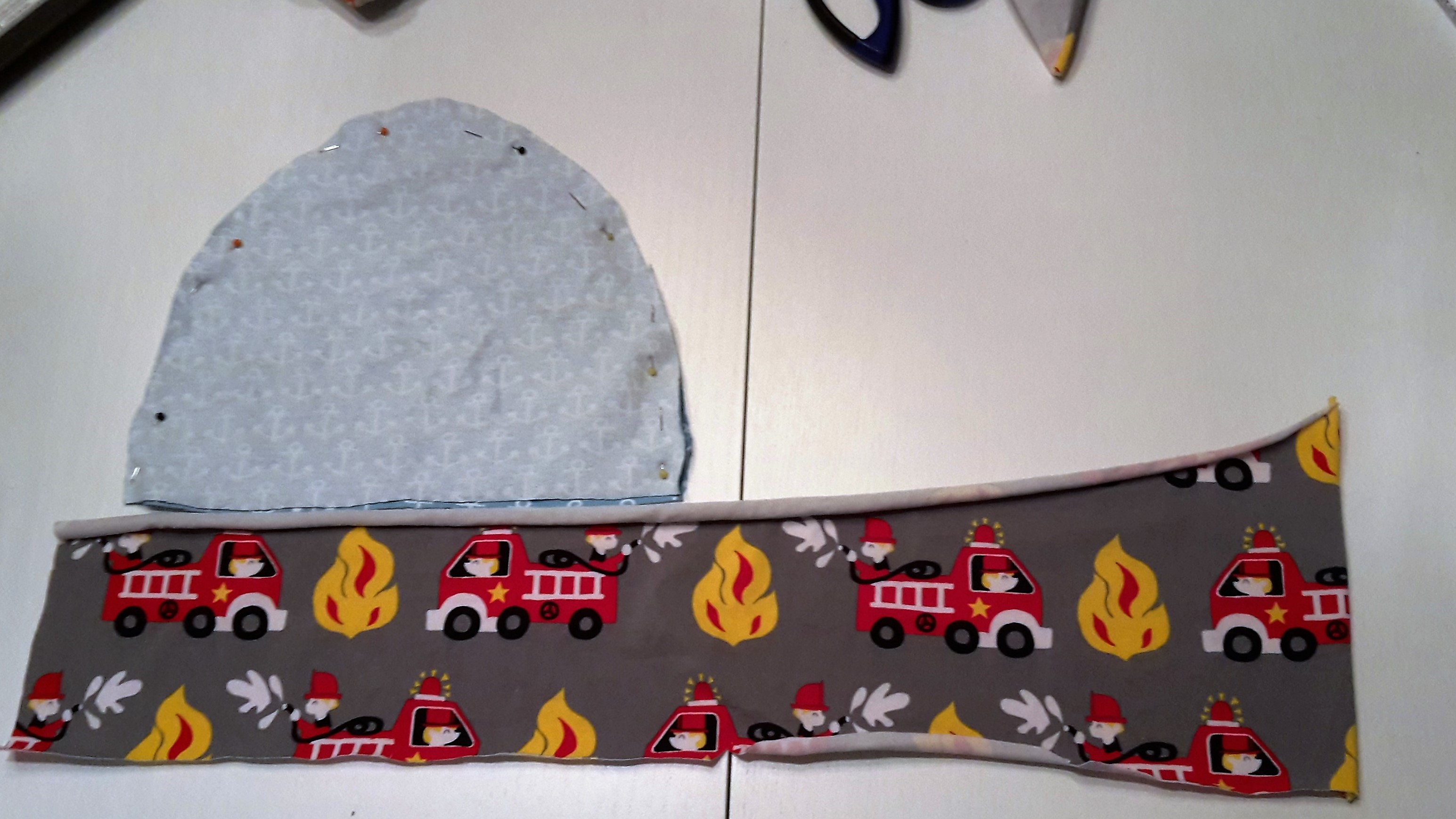 Wenn Du Dich für die zweite Variante entscheidest, muss das Band in die zusammengenähte Mütze gelegt werden und zwar mit dem Kopf nach oben. Siehe Foto. Am besten einmal mit Nadeln Probe stecken und dann umklappen, damit man sieht wie es aussehen würde. Das hilft ungemein. Lieber einmal Probestecken bevor man gleich näht und dann wieder alles auftrennen muss, weil man die Ärmel plötzlich innen hat 🙂 (Ich spreche aus Erfahrung… 😉 )