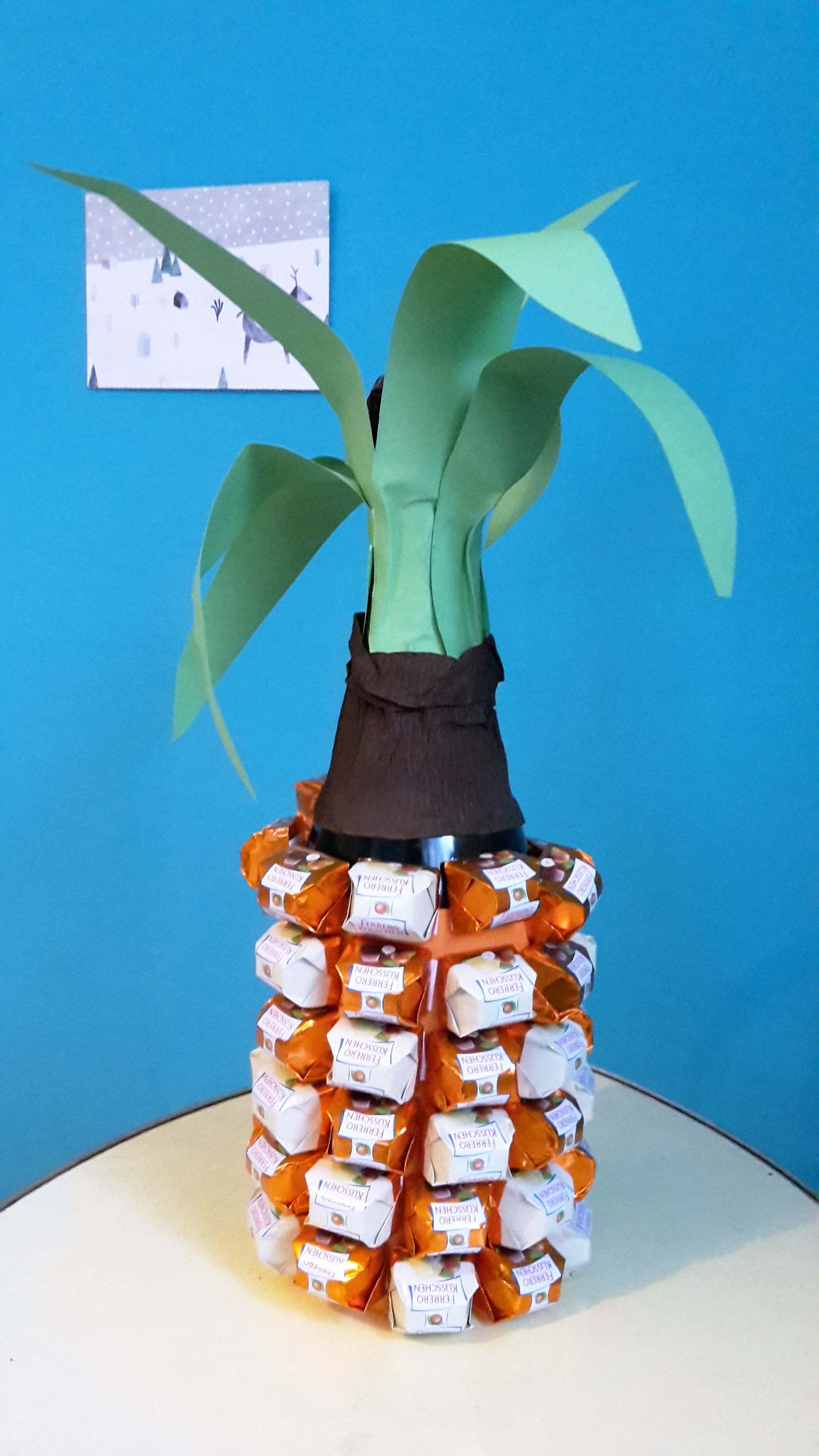 Wenn jemand gerne Rocher oder Ferrero Küsschen mag (auch die weißen) kann man gut eine Sekt-Ananas basteln: