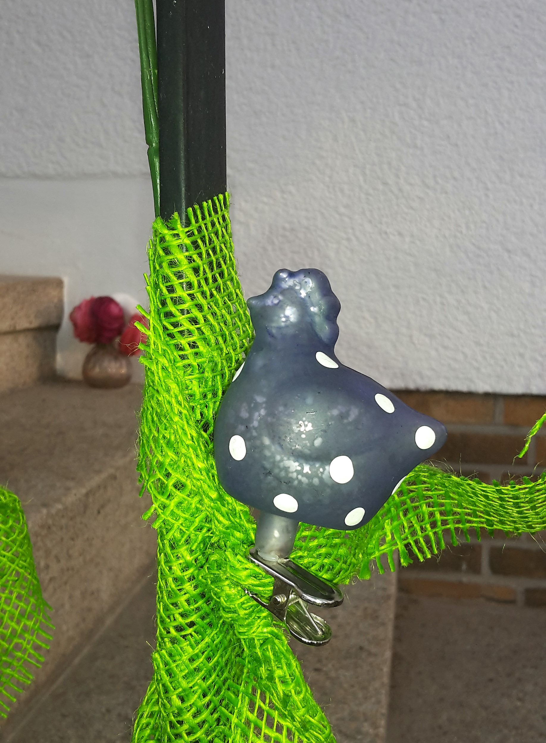 Das Treppengeländer habe ich mit künstlichen Blumen und grünem Bastband geschmückt und ein kleines blaues Huhn (von Depot) als Hingucker: