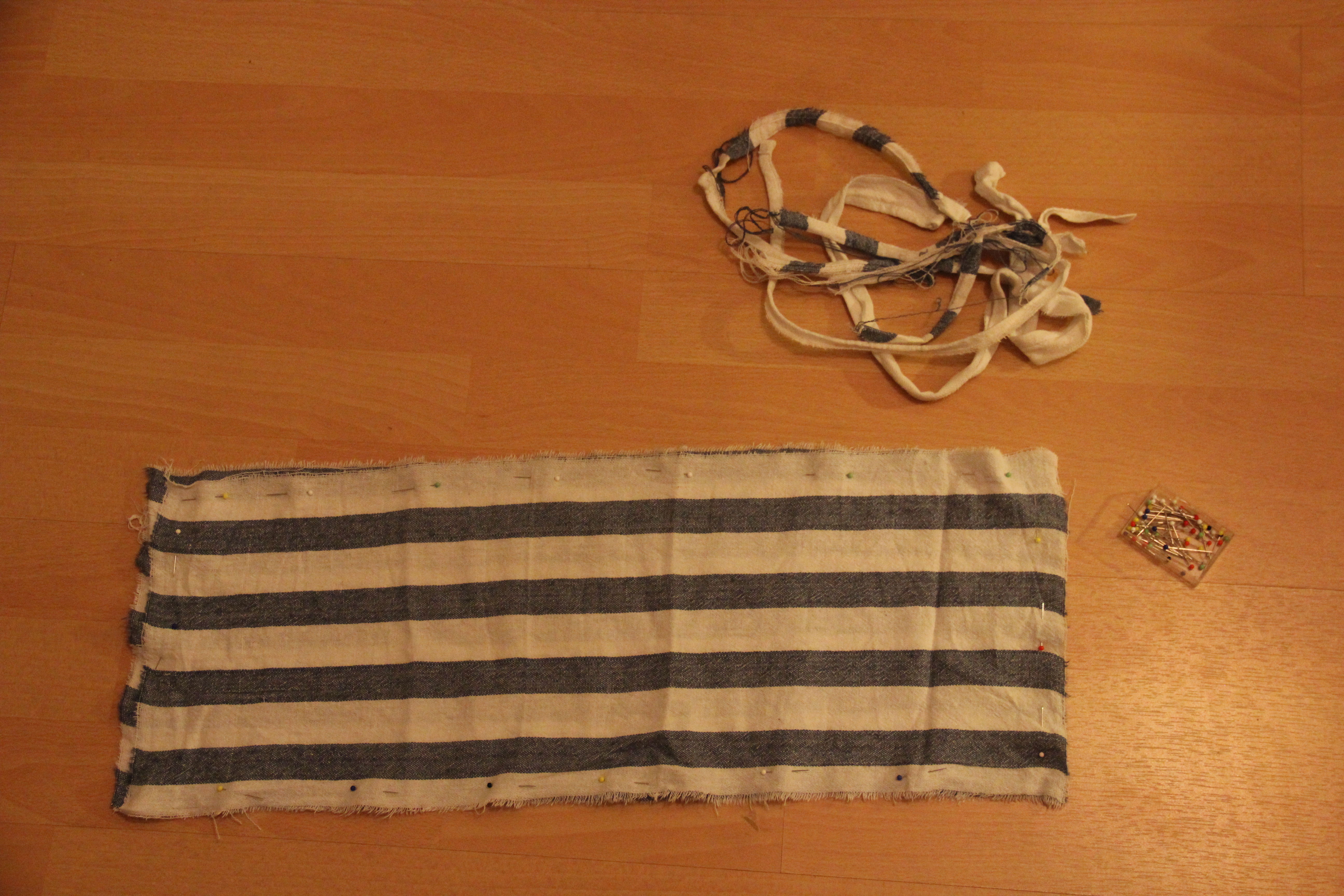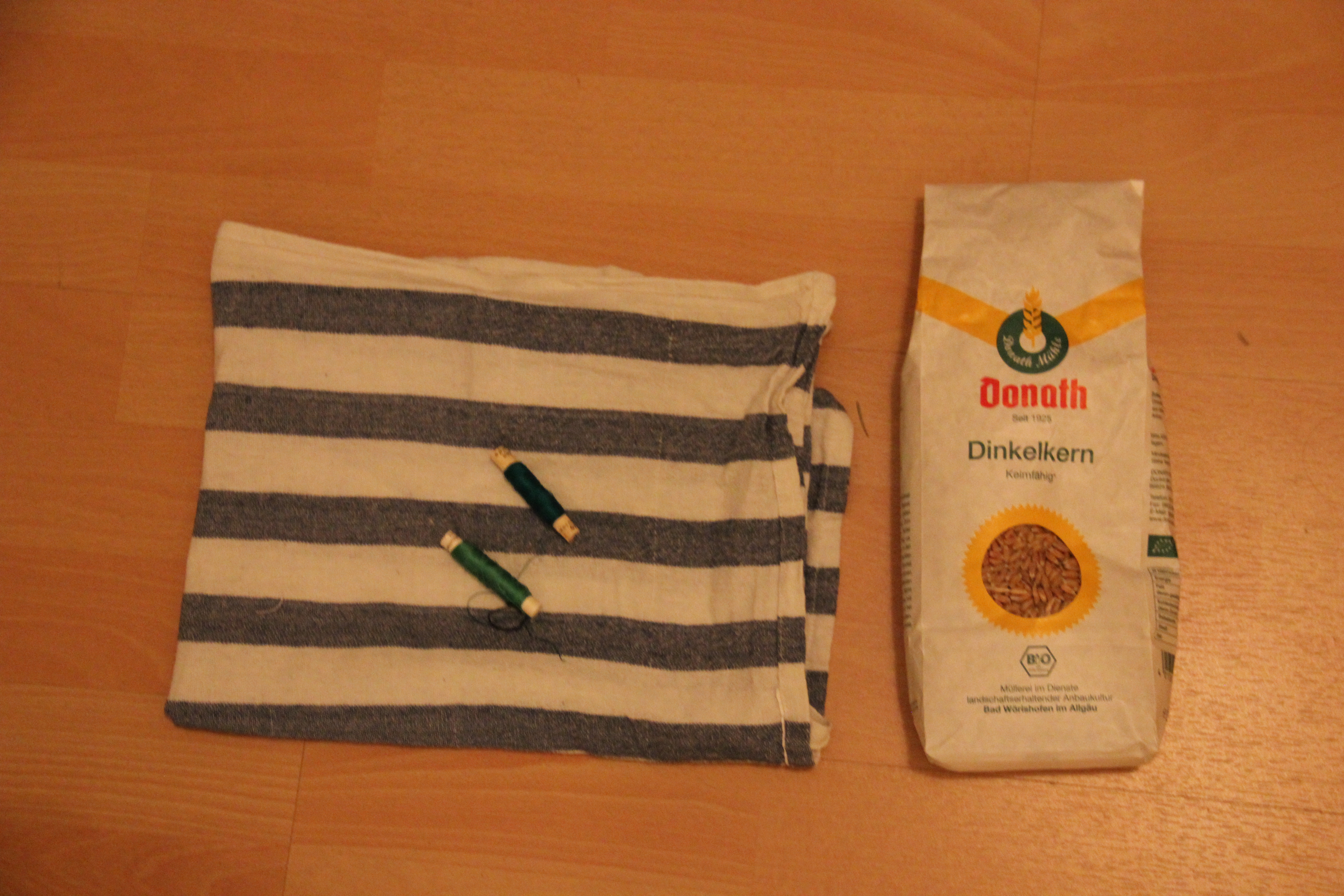 Die Grundlage für mein Dinkelkörnerkissen war ein gestreiftes Geschirrtuch – der Stoff ist schön fest und aus Baumwolle, was bei der dauernden Erhitzung zu empfehlen ist. Außerdem gibt es Geschirrtücher in so vielen schönen Mustern 🙂
