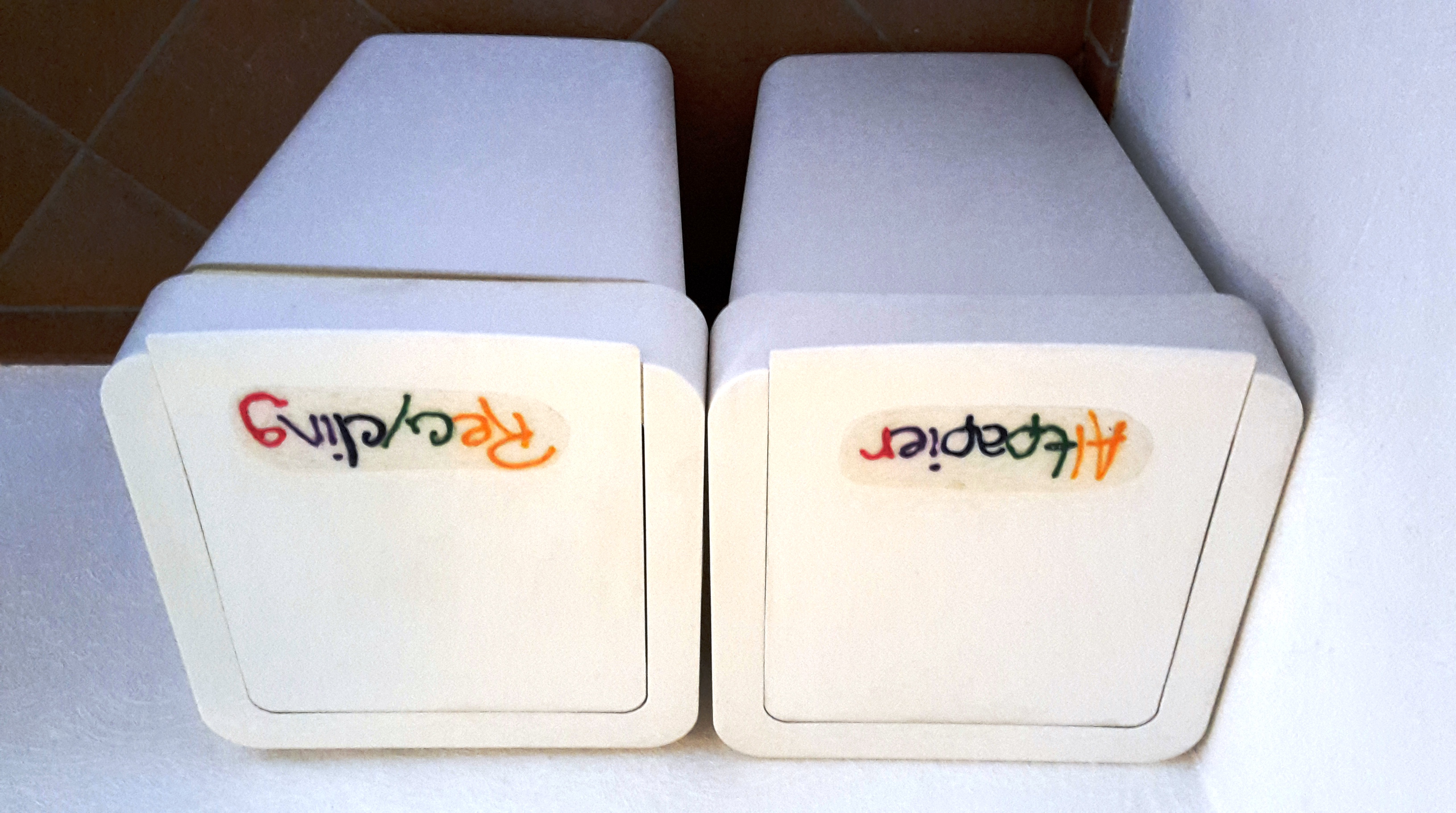 Jetzt sehen zumindest zwei der Recycling-Sachen ordentlich aus. Schon allein dadurch, dass es zwei gleich Körbe sind, ist es jetzt in der Küche aufgeräumter.