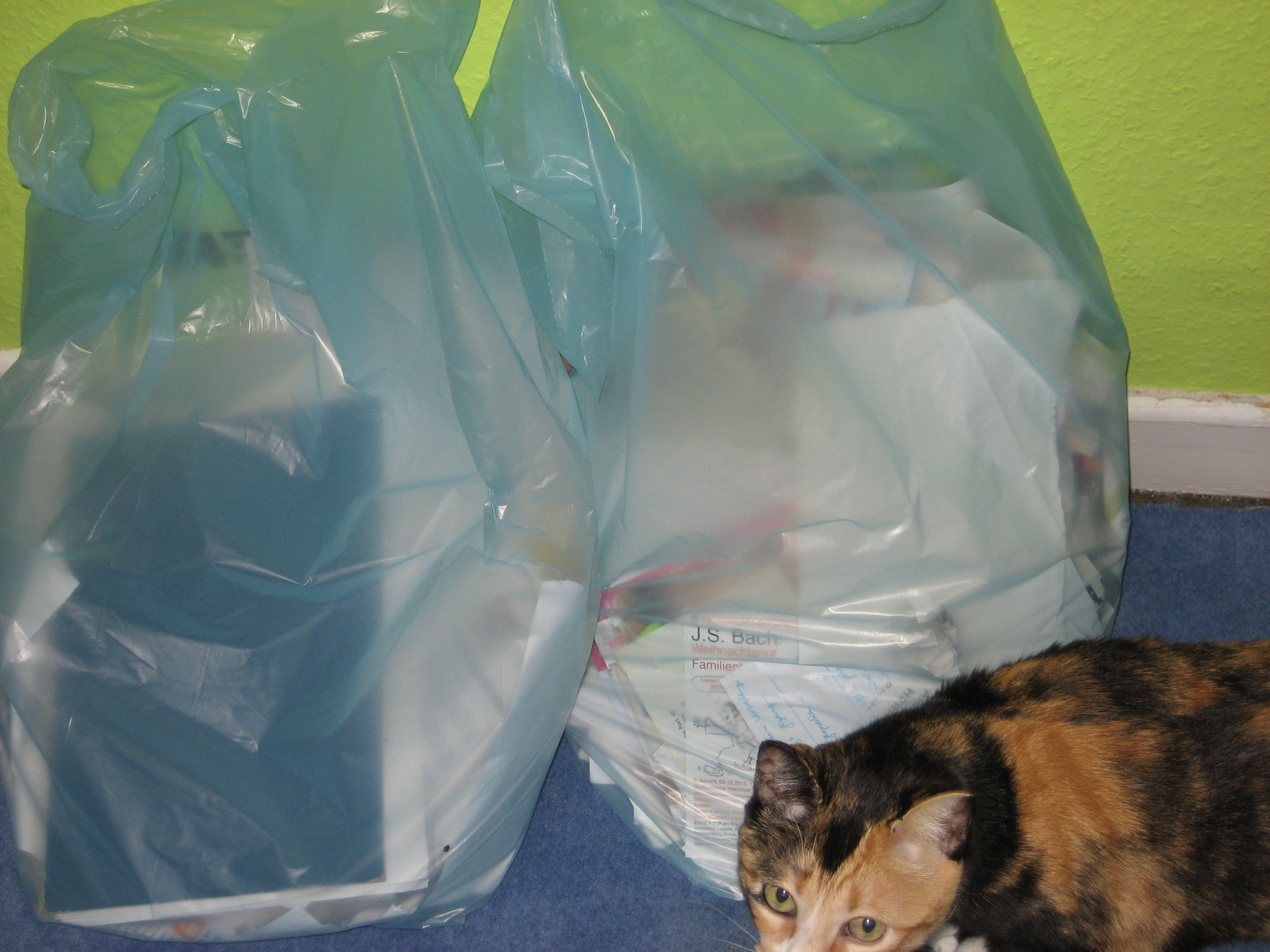Ich habe also ordentlich ausgemistet, nämlich zwei Säcke Altpapier. Hier bewundert von Katze Matilda: