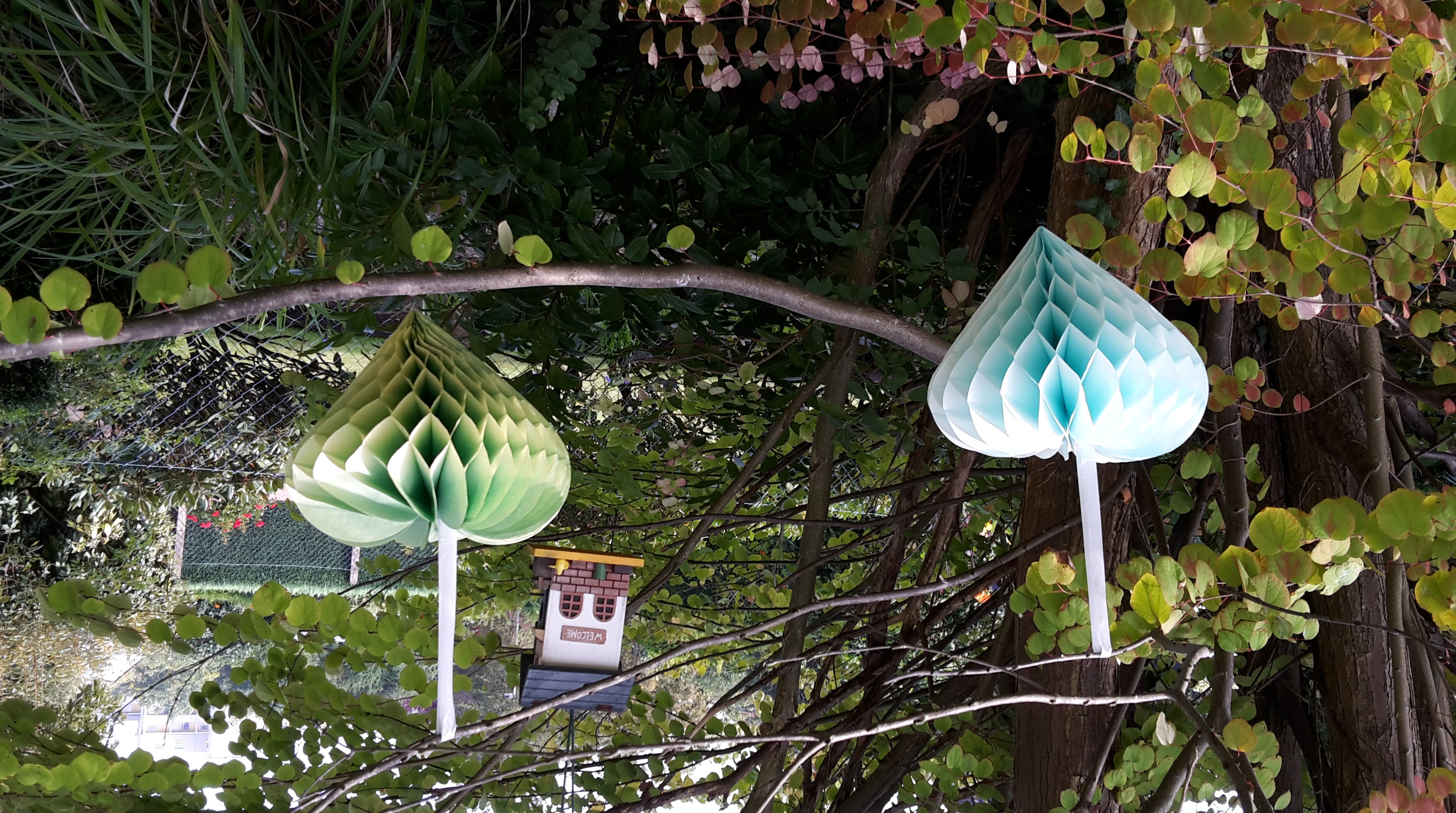 Die alten Dinger aus Papier dürfen noch bis zum nächsten Regen im Garten hängen: