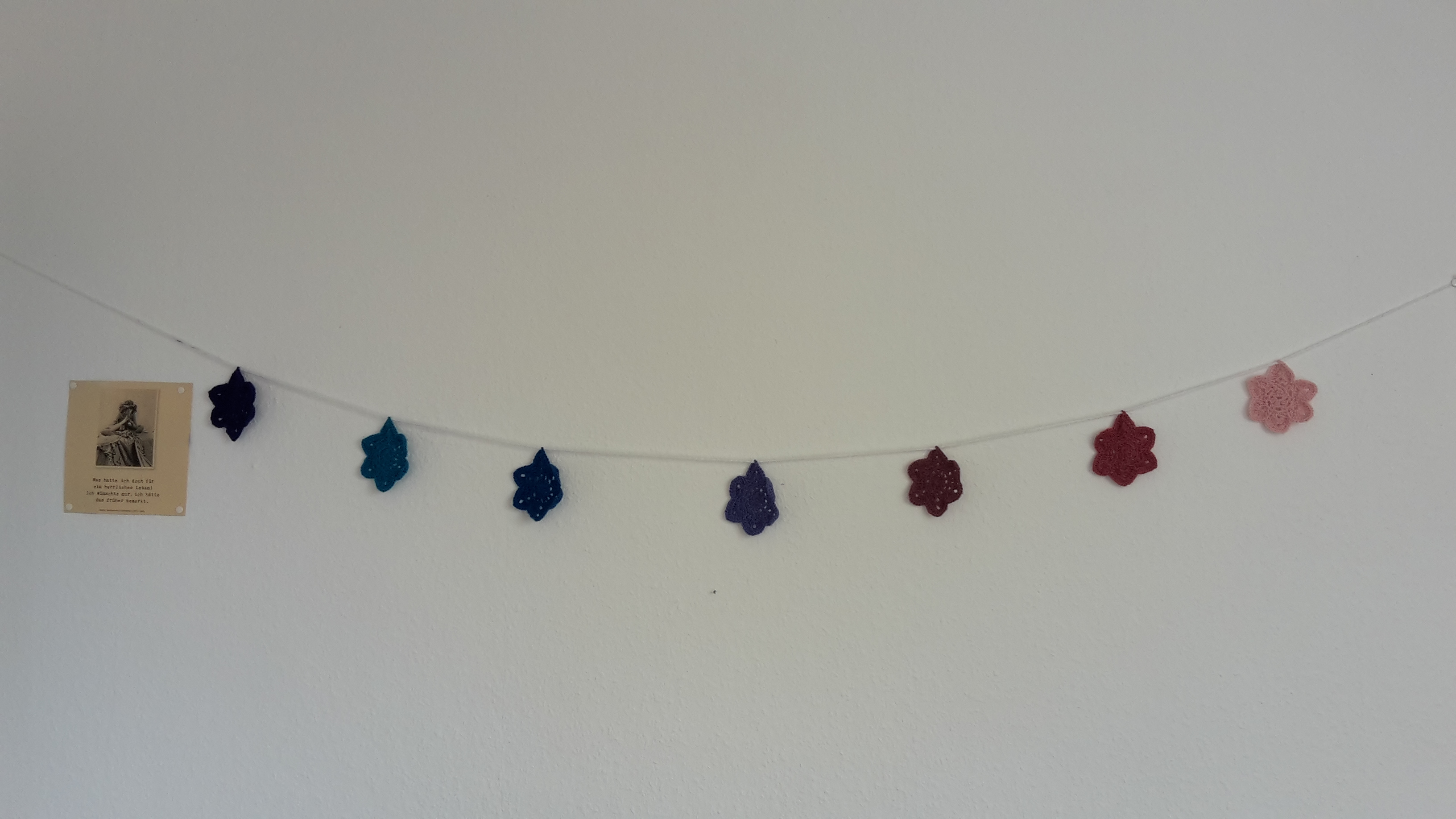 In einer der vorigen Flow-Ausgaben haben sie tolle Bilder zum Ausschneiden und kleben gehabt. Ich finde sie super und habe lange überlegt, wie ich sie gut drapieren kann. Jetzt habe ich eine Möglichkeit gefunden: Auf Wimpel geklebt wurde eine Kette daraus.