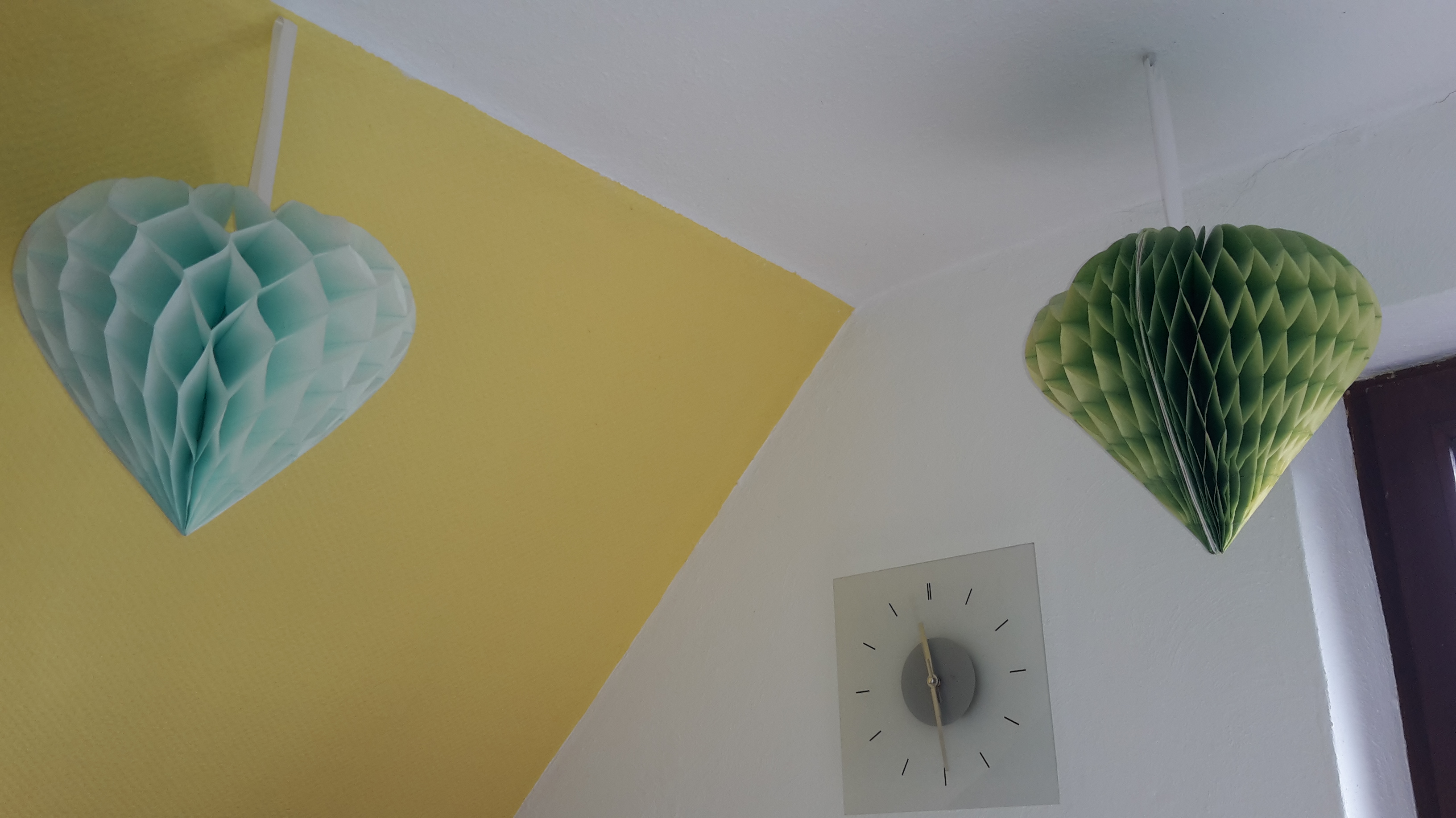 Es wurde einmal Zeit für neue Decken-Deko. Diese Herzen von IKEA waren sehr schön, sind jetzt allerdings ziemlich verblichen und ich habe sie mir übersehen. Außerdem finde ich die Uhr mittlerweile doof 😉