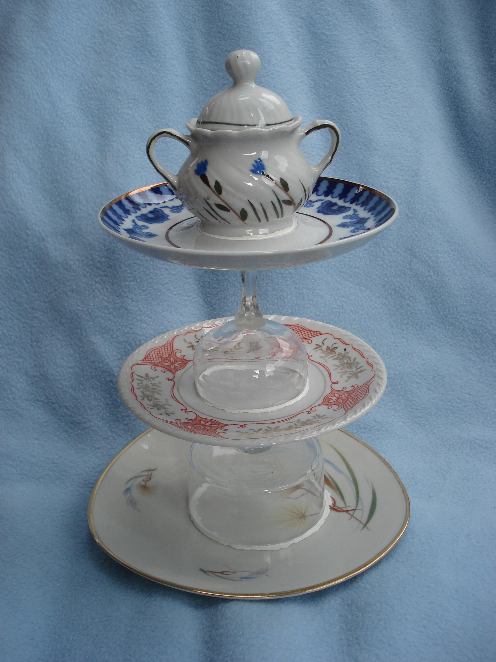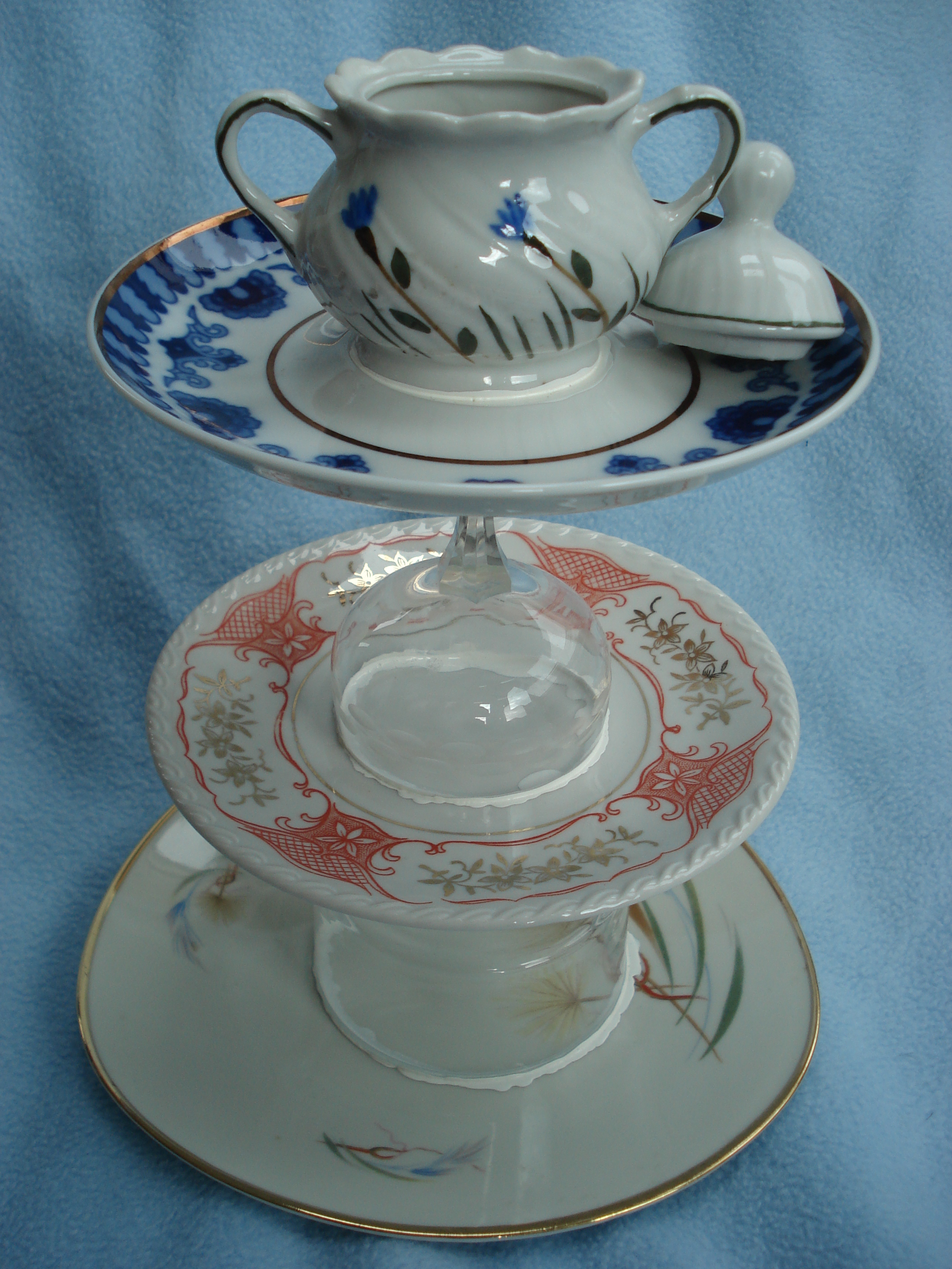Wir haben hier in der Stadt ein Sozialkaufhaus, wo an für sehr wenig Geld tolle Sachen kaufen kann. Ich habe also drei verschiedene Porzellan-Sets gekauft (nur Teller und Tasse, kein komplettes Service) und ein paar kleine Gläser als Türme zwischen den Etagen. Kostenpunkt ca. 10 Euro. Wer möchte kann ganz oben auch noch ein kleines Zuckerfass anbringen, dann passt es zum Kaffee und Kuchen-Thema.