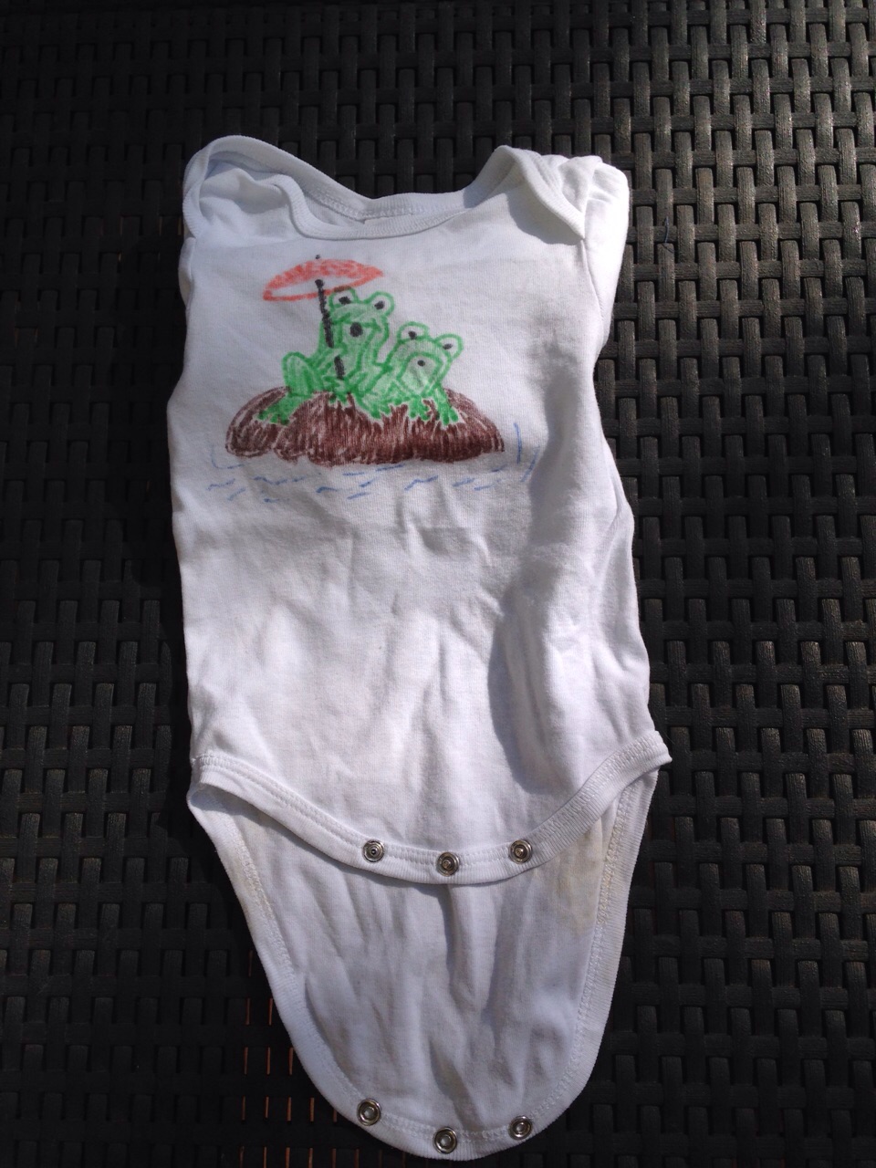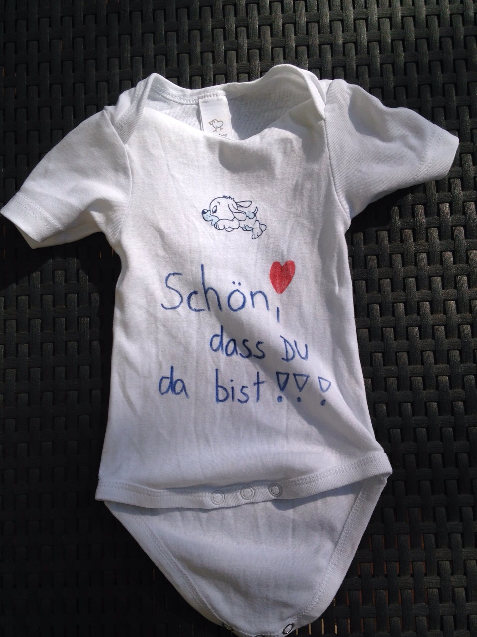 Ein tolles Spiel, dass (fast) allen Spaß macht und die werdende Mama hinterher auch noch was davon hat: Strampler bemalen. Ein paar weiße Strampler (am besten in Größe 68 oder 72, die wird meistens länger getragen als die ersten Größen) werden mit Stoffmalstiften (bei Idee oder bei amazon) bemalt.