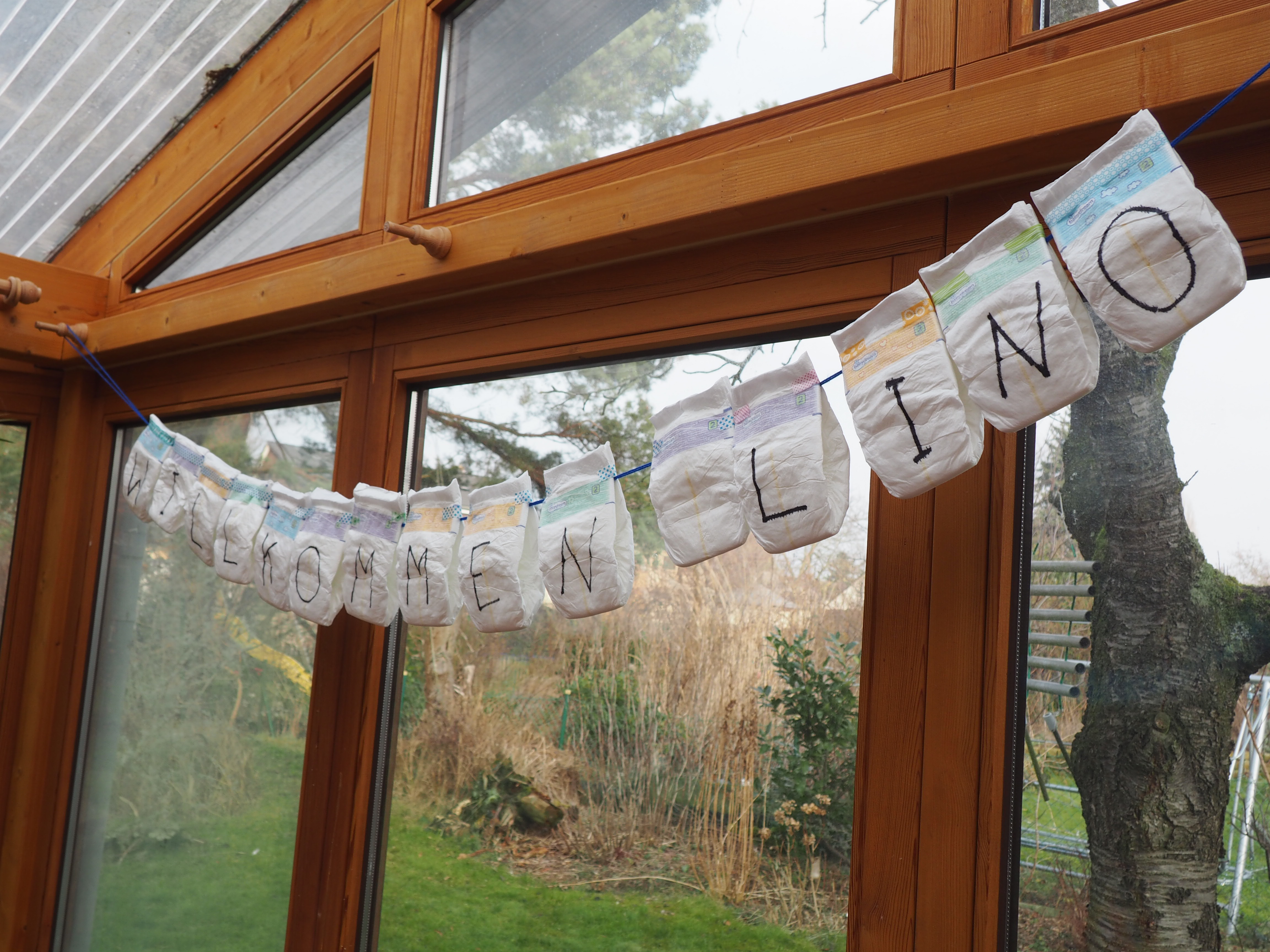 Girlande aus Babywindeln    Hier ist es beschriftet mit „Willkommen, Lino“