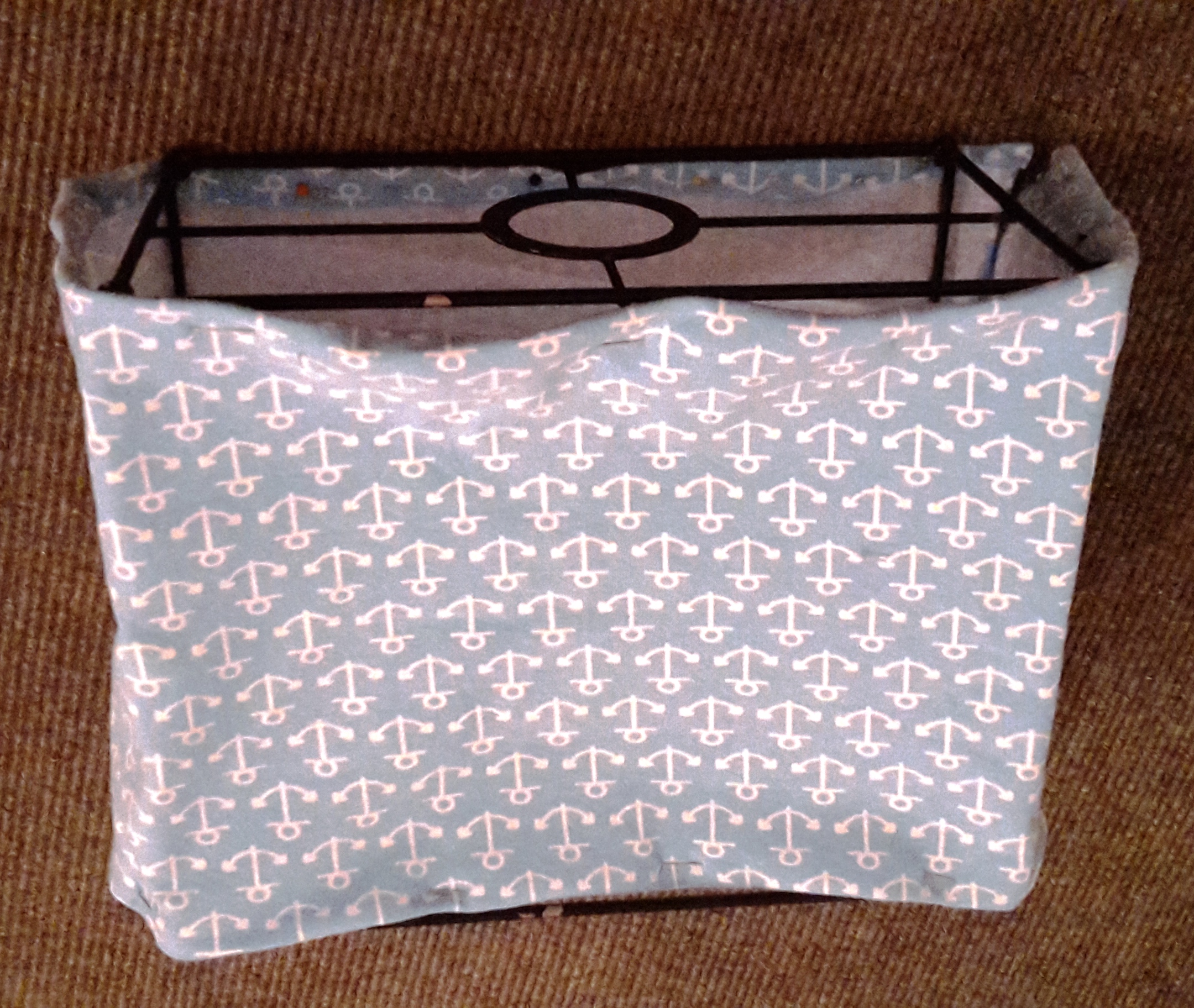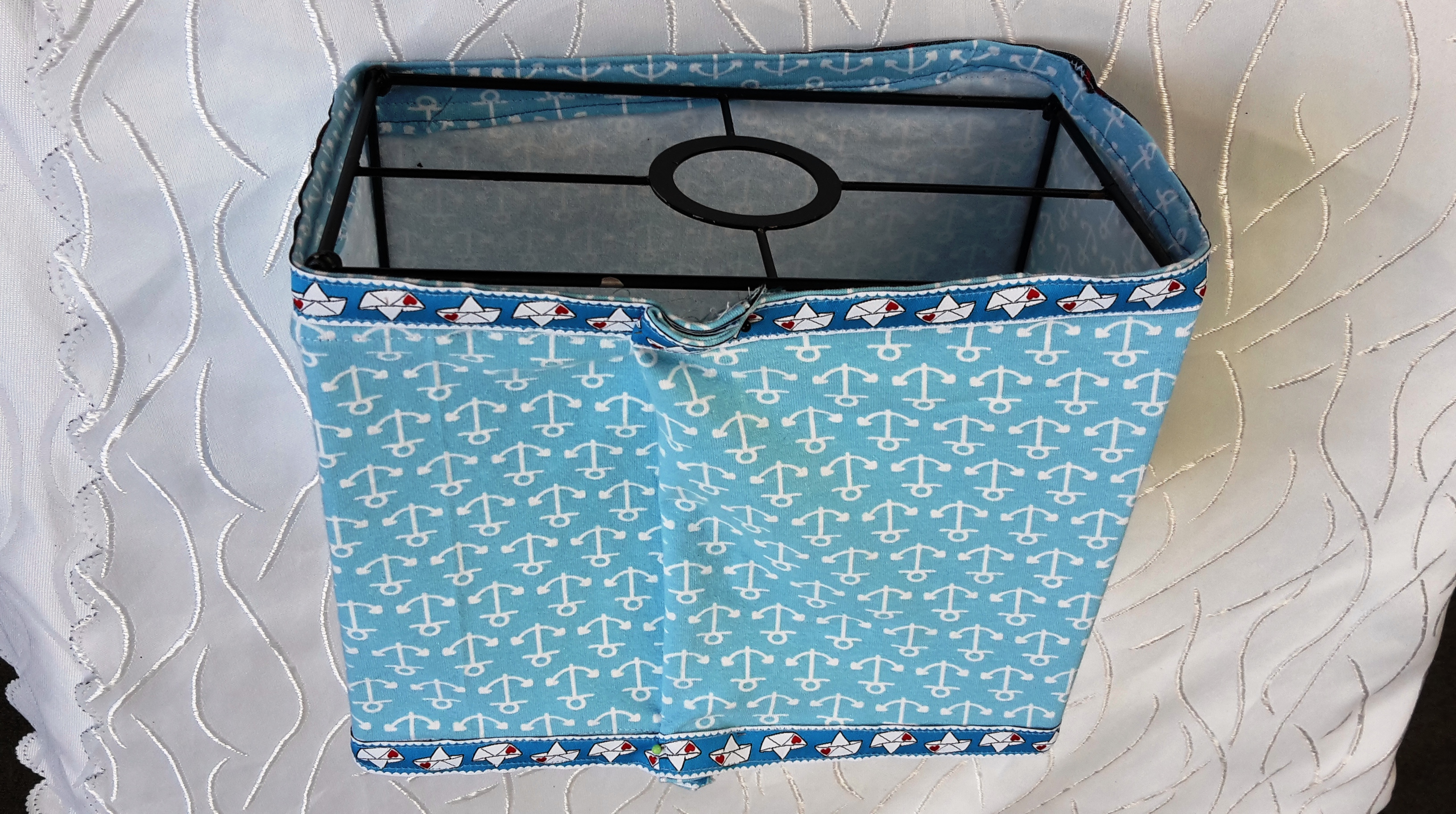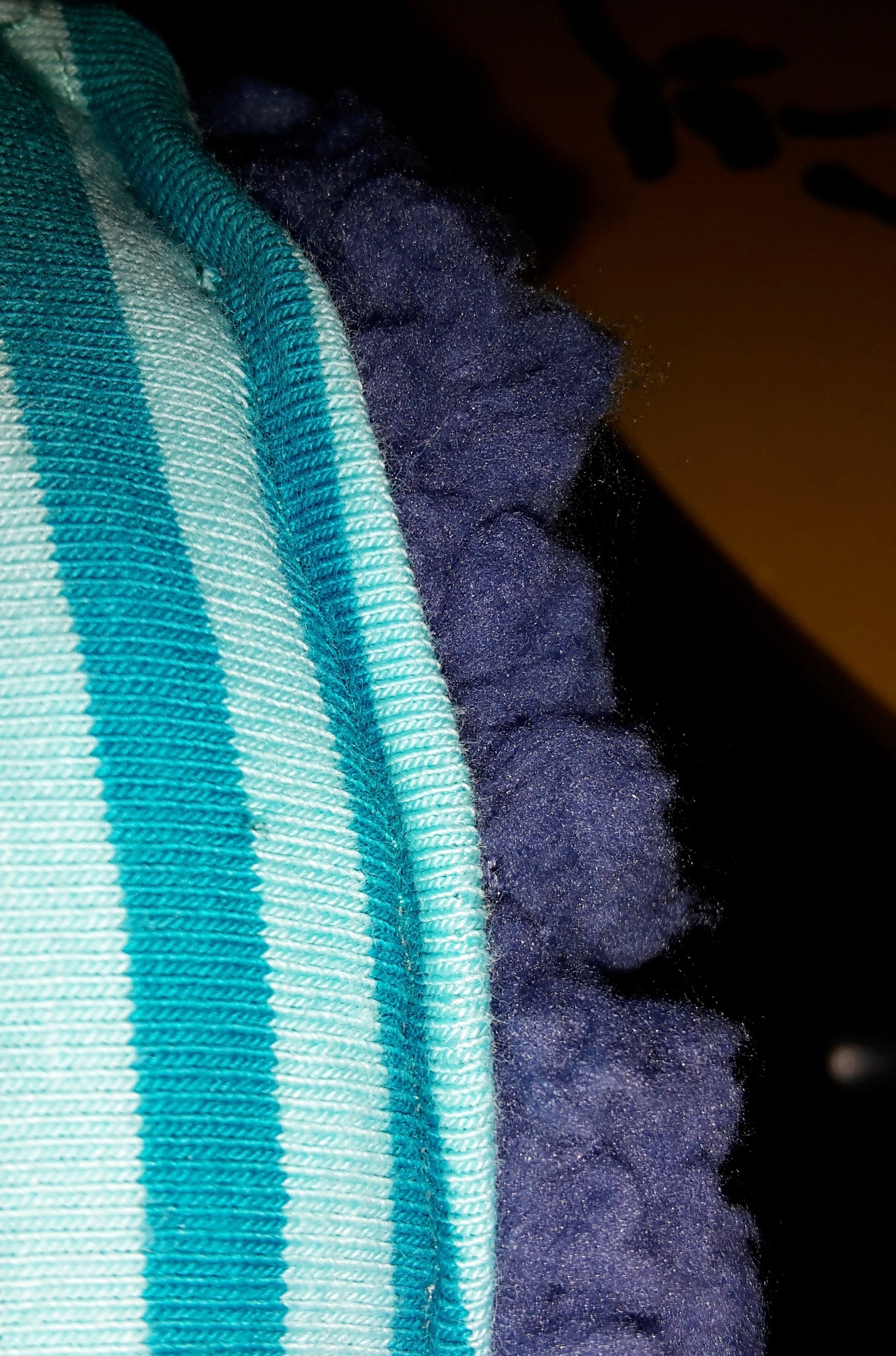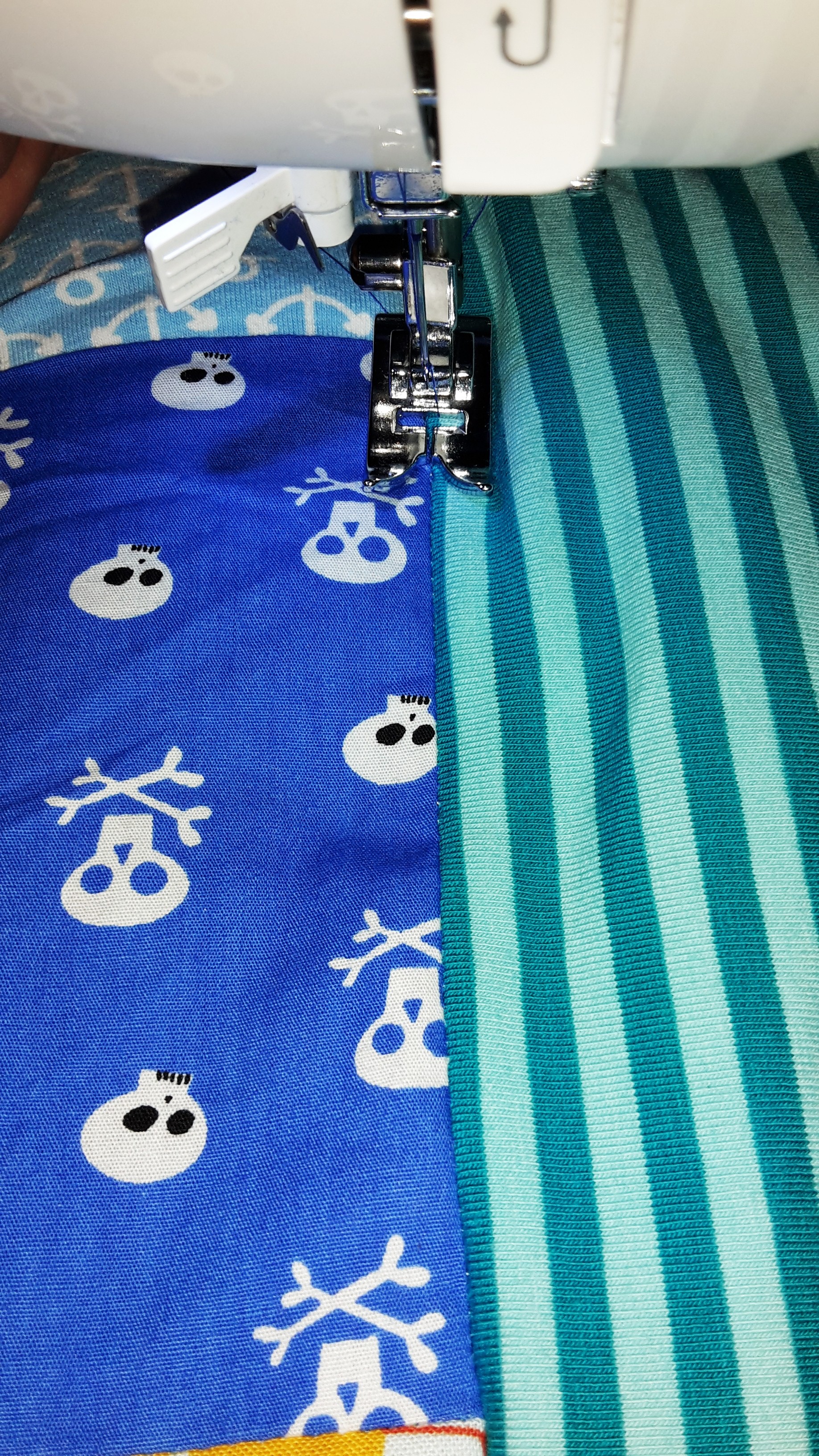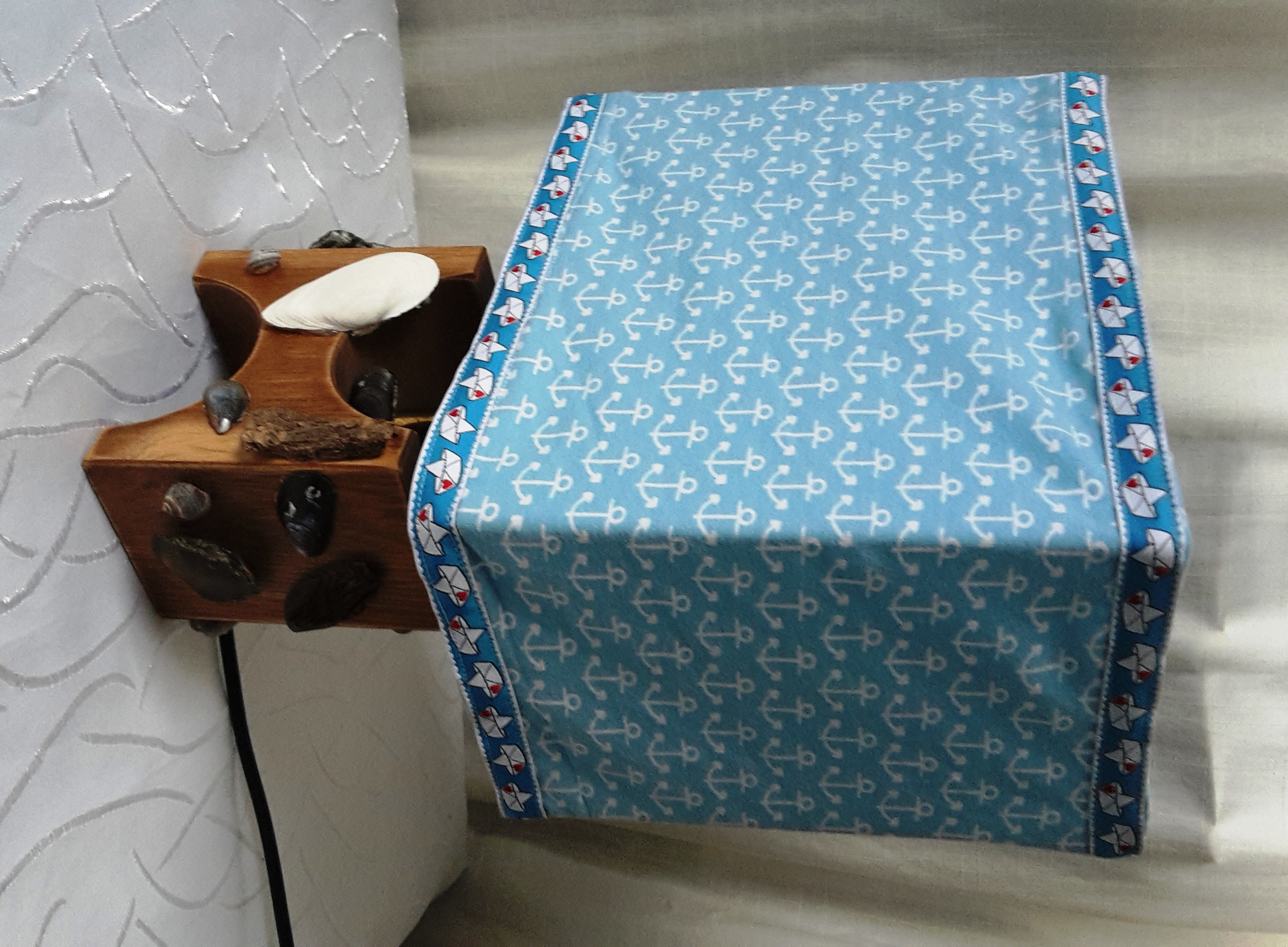 Um zu verhindern, dass sich Ober- und Unterteil der Decke ständig verschieben. habe ich nochmal in blauem Garn entlang der Linie zwischen Patchwork-Stoff und maritimem Außen-Stoff einmal rundherum genäht.