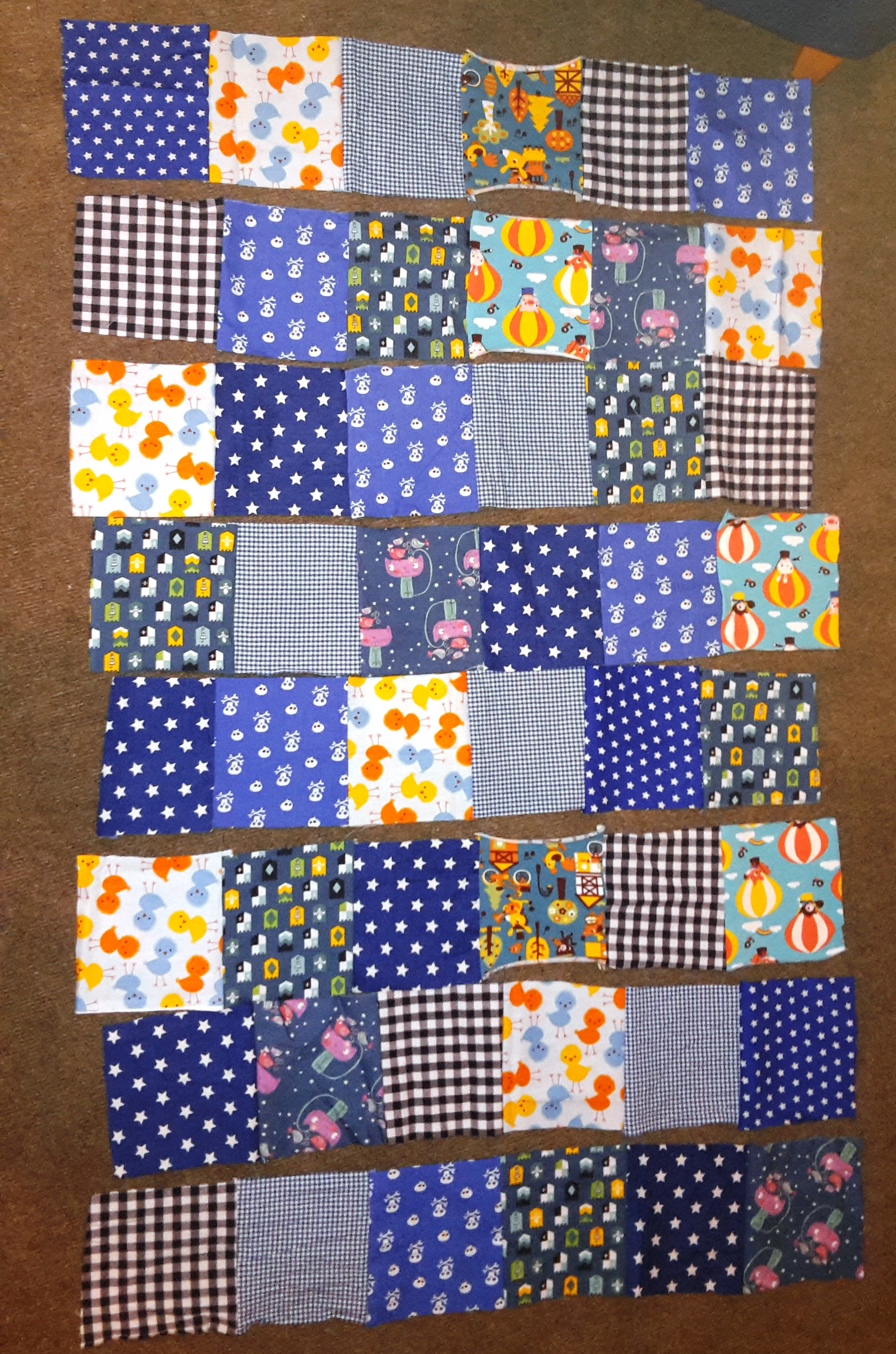 Wenn die waagerechten Quadrate fertig aneinander genäht sind, geht es mit den Streifen weiter.