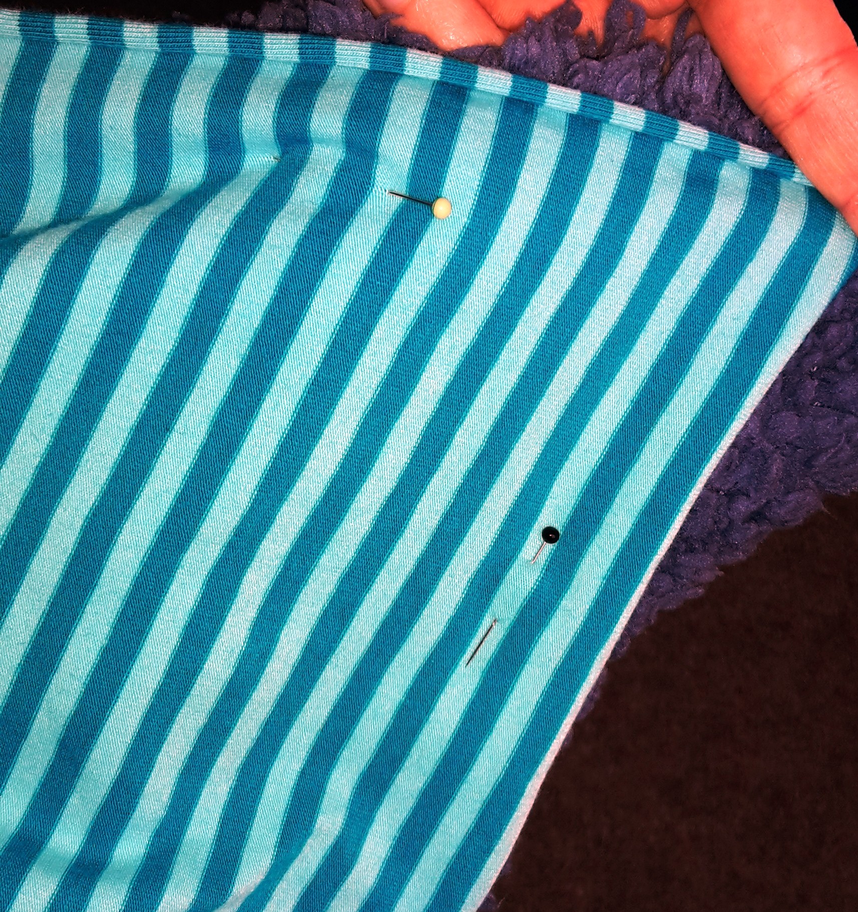 Die Öffnung feststecken, dabei die Ränder nach innen stecken. In einem Nähgarn nähen, dass ziemlich genau dieselbe Farbe wie der Oberstoff hat. Wer es ganz richtig machen will, nimmt den Unterfaden in der Farbe des Unterstoffes.