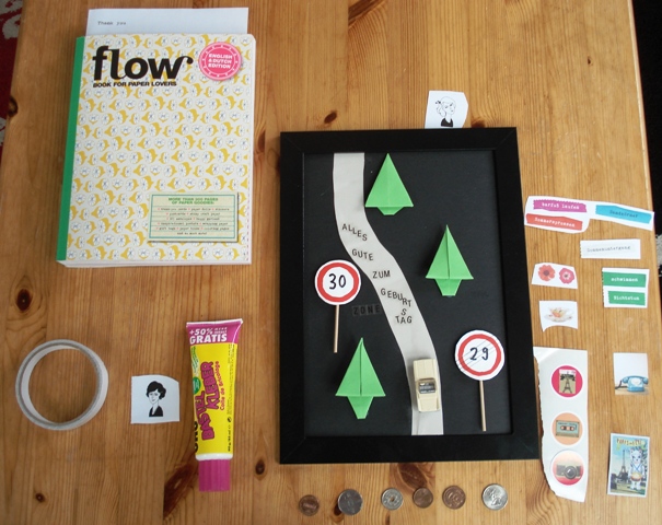 Ich habe die rechte Seite abgetrennt und auf die linke Seite ein hübsches Papier geklebt, auf das man allerdings nur schlecht schreiben kann. Deshalb noch ein weißes Papier in die Mitte 🙂