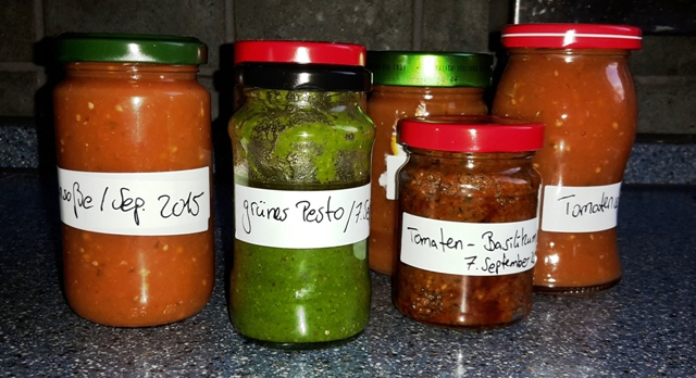 Eine Freundin hatte viel Basilikum übrig, einen richtig großen Busch und wusste nicht, was sie damit machen sollte. Wir haben überlegt, dass Pesto doch eine tolle Verwertung wäre. Ich hatte noch viel Oregano im Garten und dann haben wir einfach alles mit Olivenöl, Knoblauch, Salz, Pfeffer püriert. Es ist nicht sooo ewig haltbar wie das aus dem Supermarkt, aber es schmeckt 1000 mal besser.