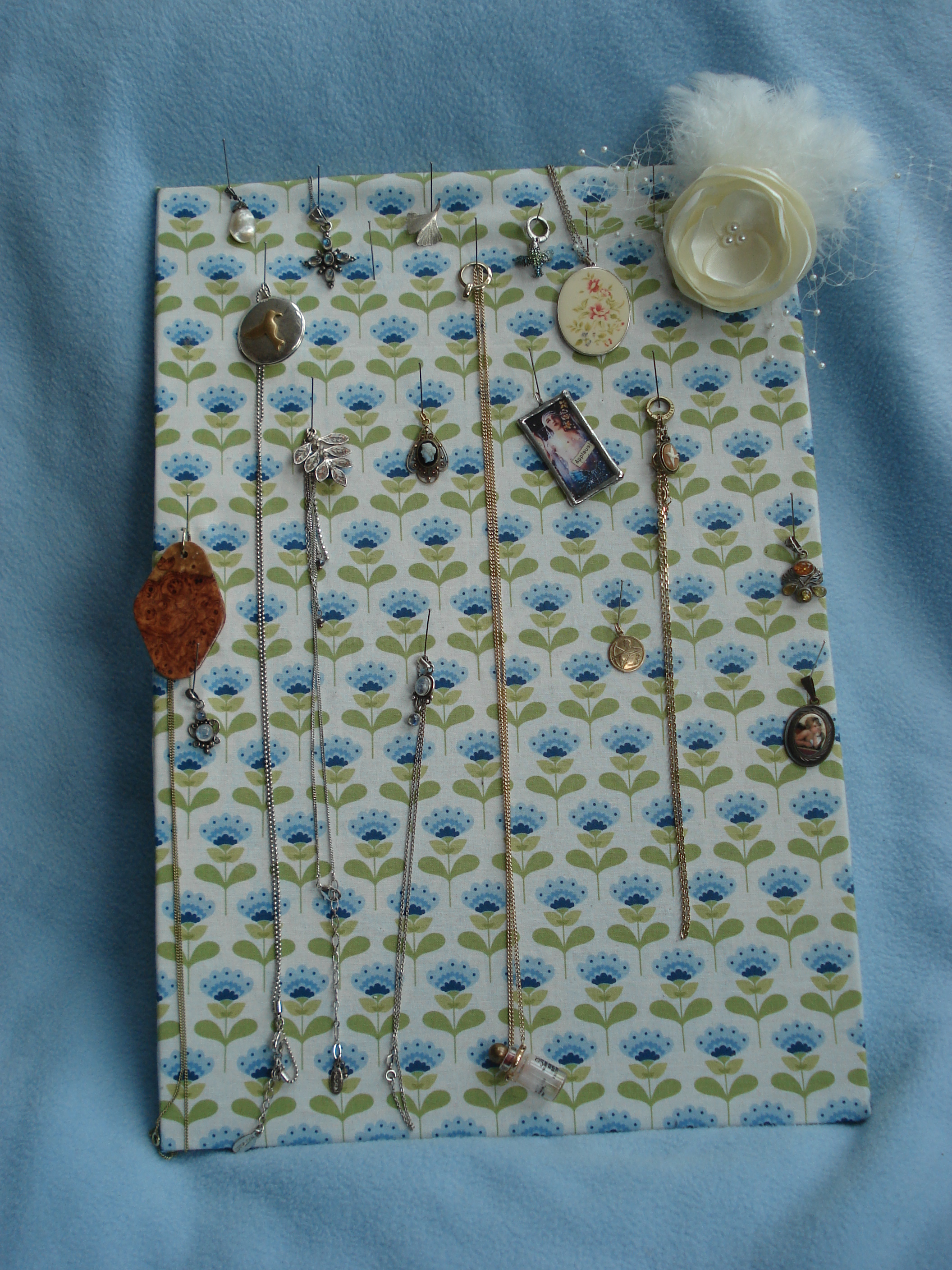 Dann noch Nadeln in beliebiger Anzahl einstechen und den Schmuck dranhängen. Ich habe Ketten genommen, aber es gehen auch Ringe oder Ohrringe evt. auch Armreifen.